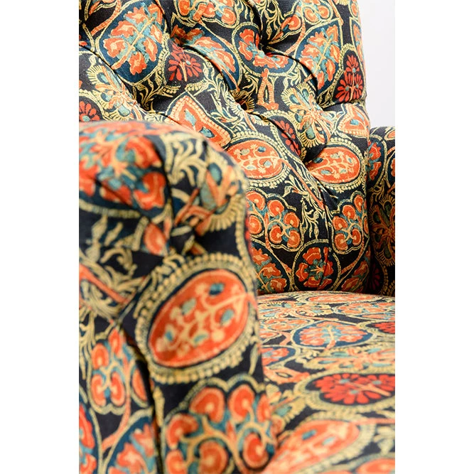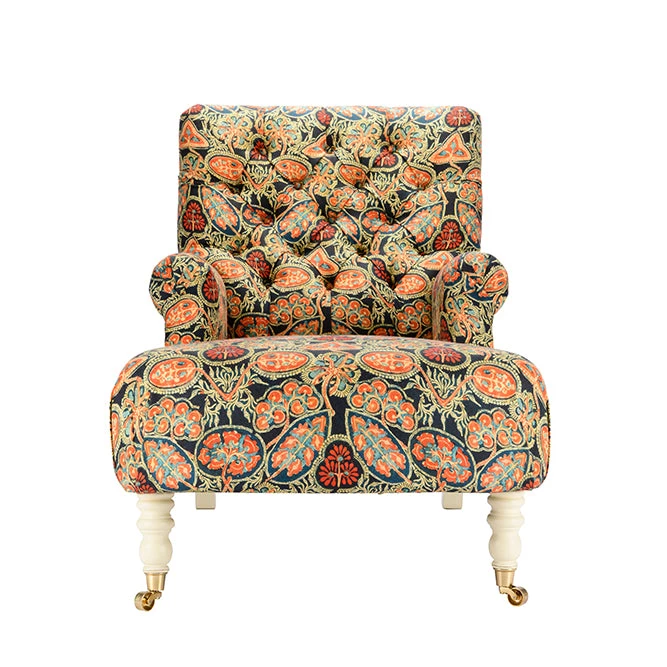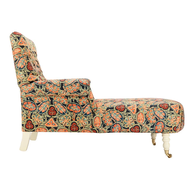 Mind the Gap’s collection of whimsical fabrics continues into this eclectic offering of furniture. This statement chaise features rollover arms and a sophisticated silhouette by the tufted backrest adding both elegance and function to your space. Crafted from beechwood and upholstered with a soft foam filling. Tapered grey washed legs and gold castors.
