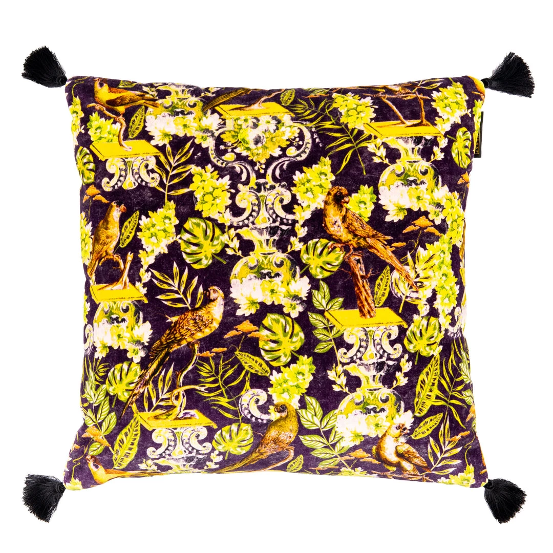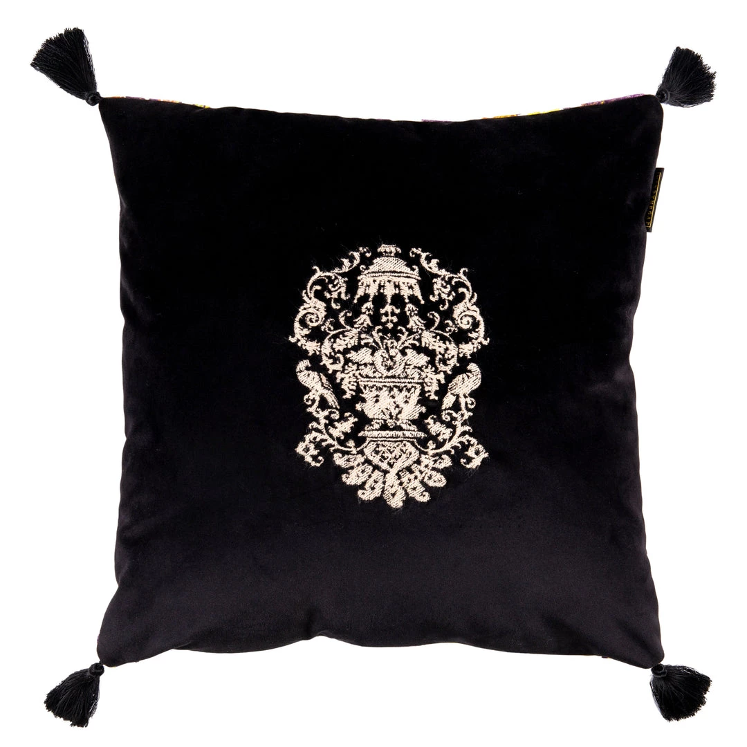 A lush cushion with a noble Transylvanian family crest on one side , the other side with our luxurious La Voliere cotton velvet .Finished with four black tassels and 100% duck feather filling. Â Â