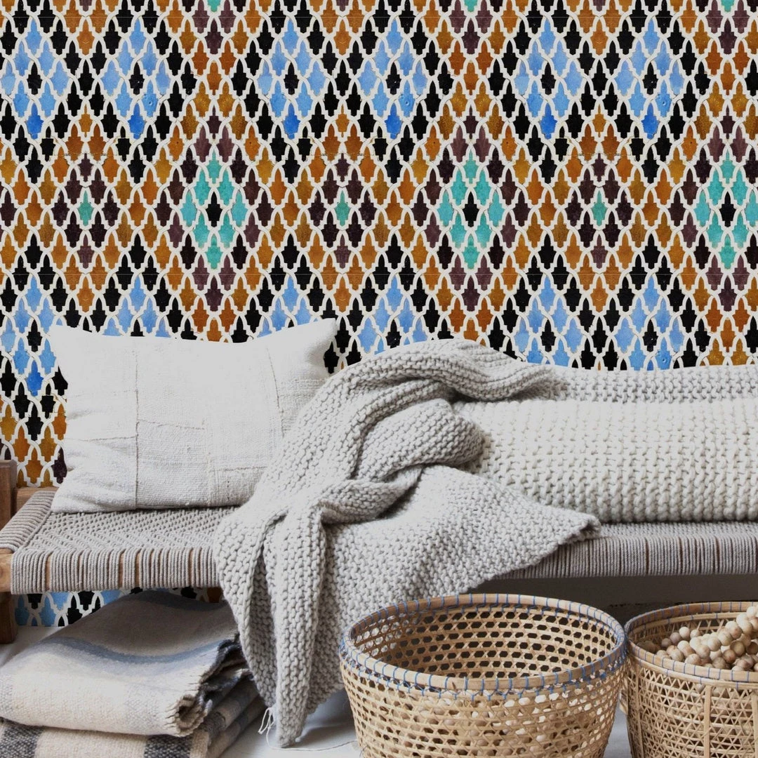 Surround yourself with this beautiful and bright Medersa El-Attarine wallpaper from Mind The Gap. Inspired by the ancient temple Medersa El Attarine in Fez, Morocco, this wallpaper will be sure to add a zing to any space. Easy to put up with the paste the wall application and will enhance any room whether it is one wall or all. This wallpaper is digitally printed using eco-friendly inks.Â