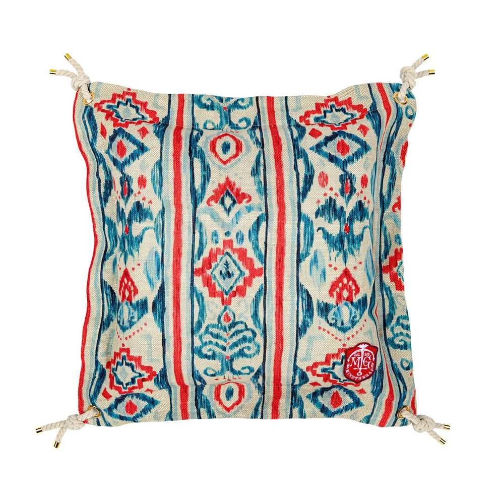 True Mediterranean colours blend beautifully together in an elegant story of Greek summer’s bliss, reflected in the MEDITERRANEO IKAT cushion. Shapes and soft strokes of paint retrace the character of the sun-kissed poppy flowers in a beautiful design printed on natural linen. Decorated with brass eyelets and white rope knots on each corner, the cushion is finished with an embroidered marine crest on the lower right corner. Comes with feather filling.
