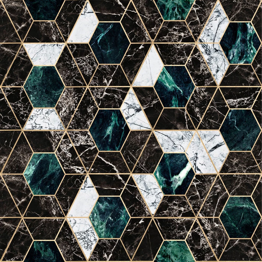 Make a statement with the Hexa wallpaper from Mind The Gap. Featuring a gorgeous large-scale contemporary, geometrical print with jade and marble accents. An impactful feature for any home. Printed on metallic foil. Easy to put up with the paste the wall application and will enhance any room whether it is one wall or all. This wallpaper is digitally printed using eco-friendly inks.Â