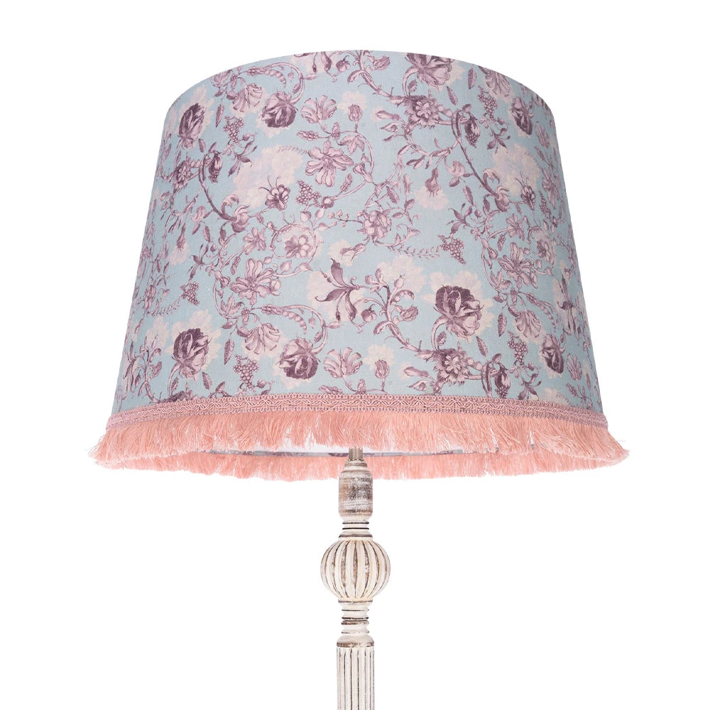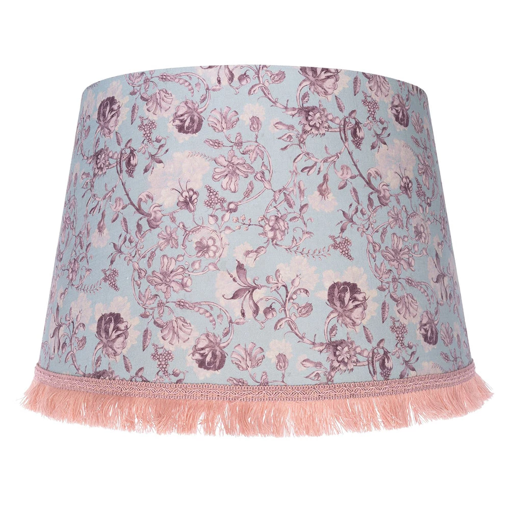 A soft BOHO style lampshade with large scale ornaments in light blue and muted purple tones. Finished with metallic silver lining and pink short fringe.