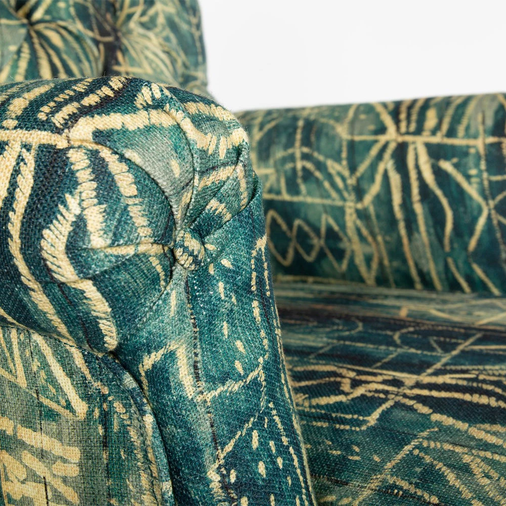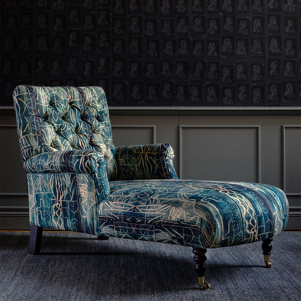Mind the Gap’s collection of whimsical fabrics continues into this eclectic offering of furniture. This statement chaise features rollover arms and a sophisticated silhouette by the tufted backrest adding both elegance and function to your space. Crafted from beechwood and upholstered with a soft foam filling. Tapered grey washed legs and gold castors. BAMBILELE 100% linen in a rich cultural pattern, tones of Blue , Brown and yellow.Â