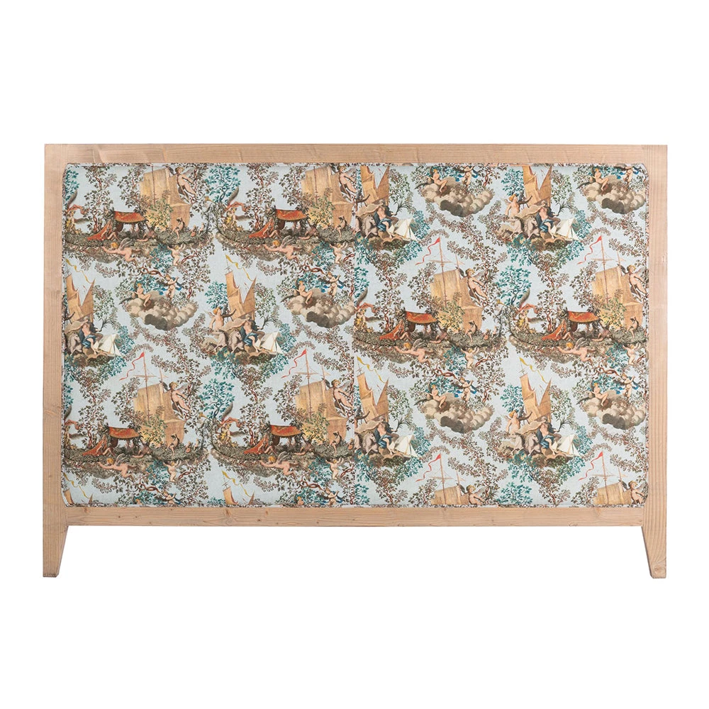 Mind the Gap’s collection of whimsical fabrics continues into this eclectic offering of furniture. Shown here in JOURNEY TO EDEN A stylish handcrafted headboard made of distressed pinewood turned frame and a beautiful tufted board adding both elegance and theatre to your sanctuary .