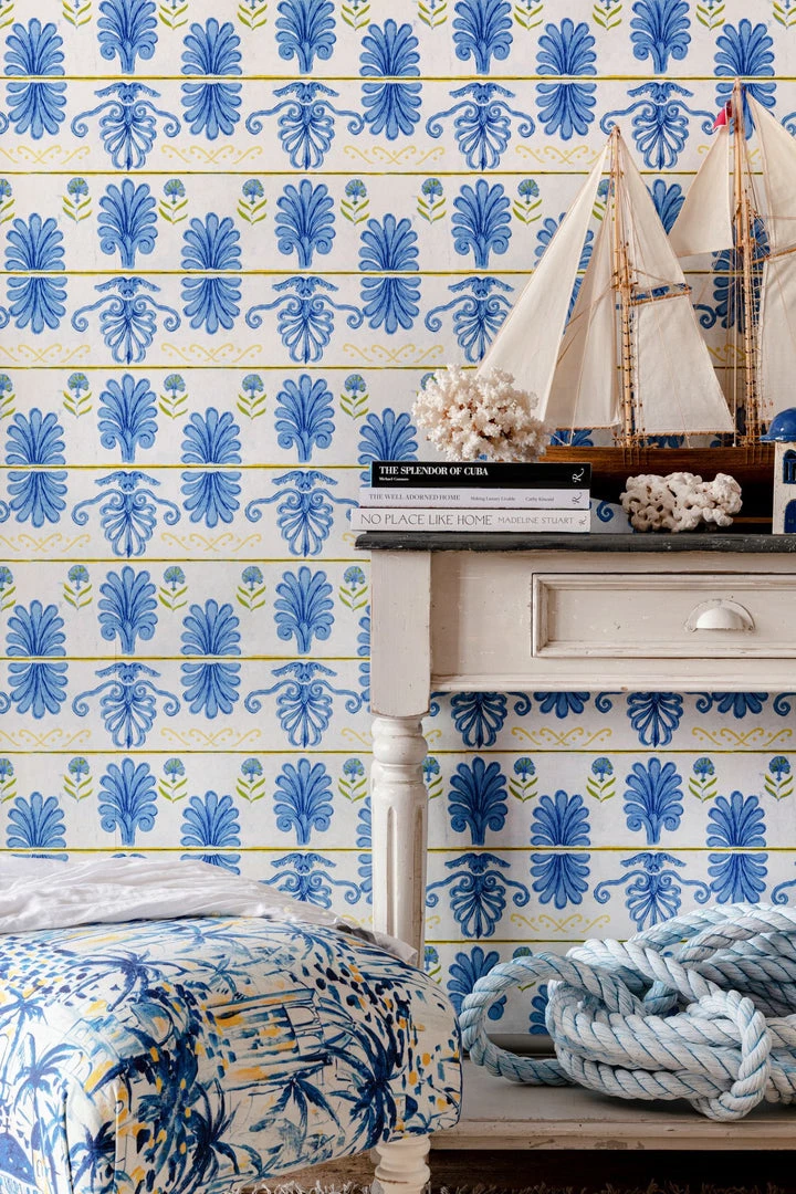 Fine ornaments showing decorative algae are highlighted in this delicate embellished pattern, creating a luxurious decorative wallpaper. Feel the warmth of a hot summer’s day wrapped within the walls of a splendid holiday villa. This complementary design is available in Island Green, Azure, Taupe, White Sand and Lemon.