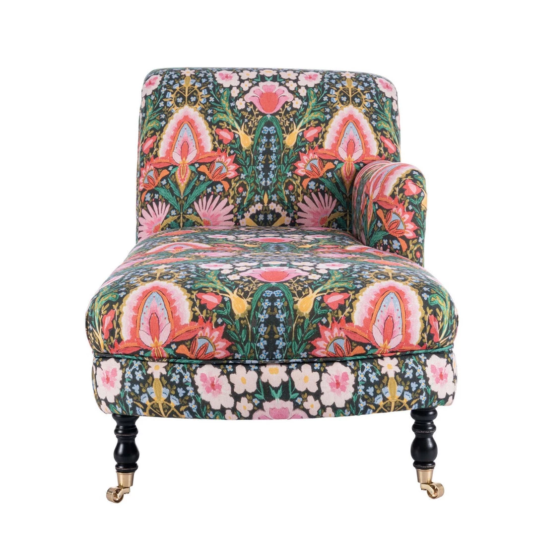 The perfect place to ‘relax man’…elegant and imposing, the ANATOLIA Chaise features an open side and one rollover arm with a sophisticated silhouette enhanced by the long sitting pad. Designed to add both elegance and function to your space, it is crafted from beech wood and upholstered in a soft, vivid fabric for the utmost relaxation. The distinctive chaise is finished with black turned castor gold legs.