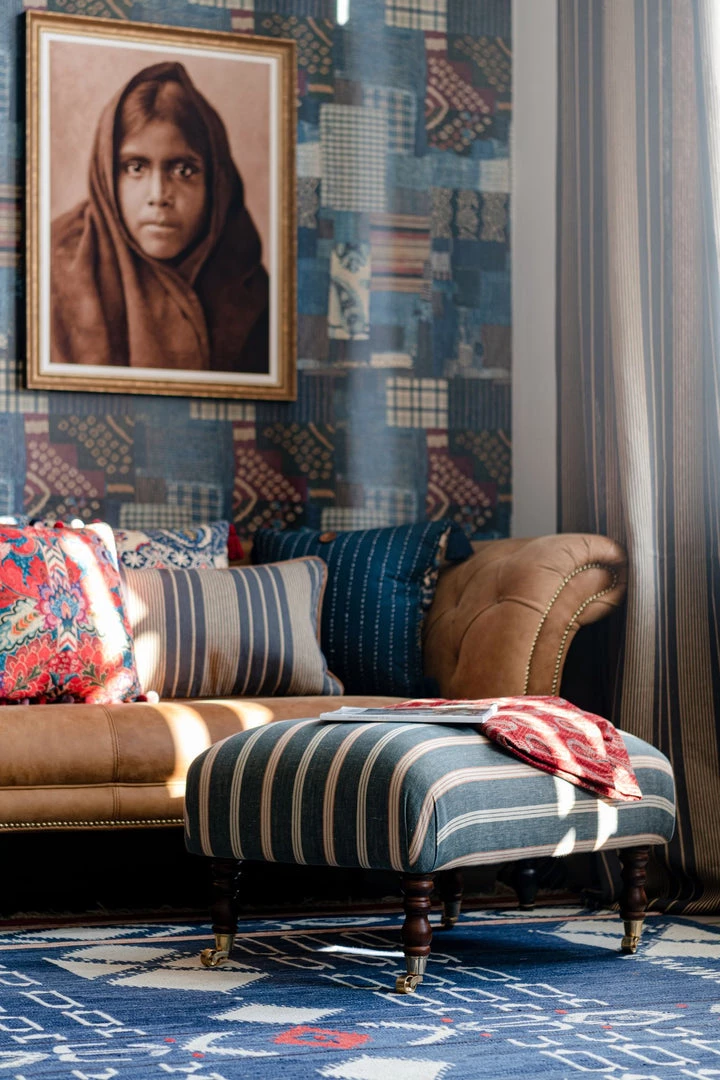 A piece-of-art ottoman with a cushioned seating, this HUDSON stool is dressed in OREGON STRIPES Washed Linen. The beautiful turned cherry brown legs are finished with gold castors.