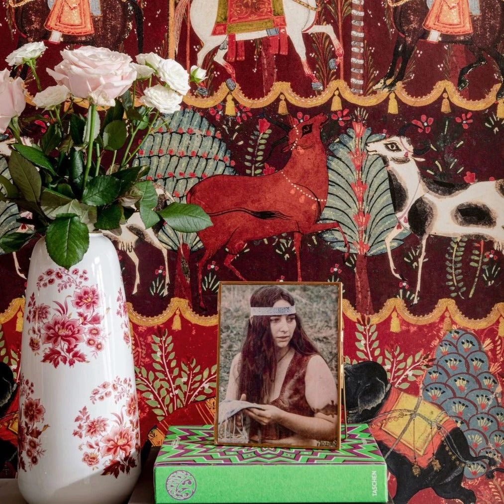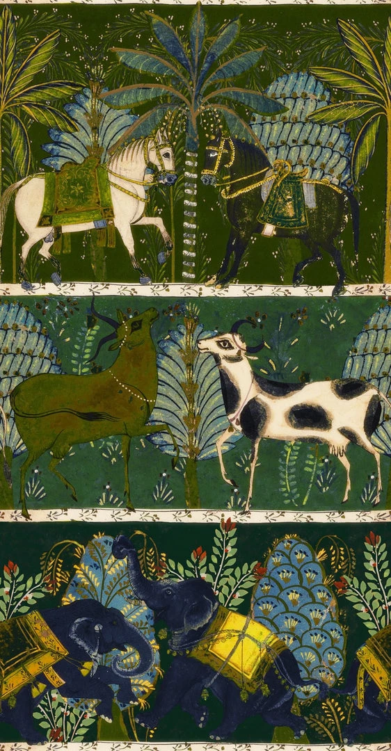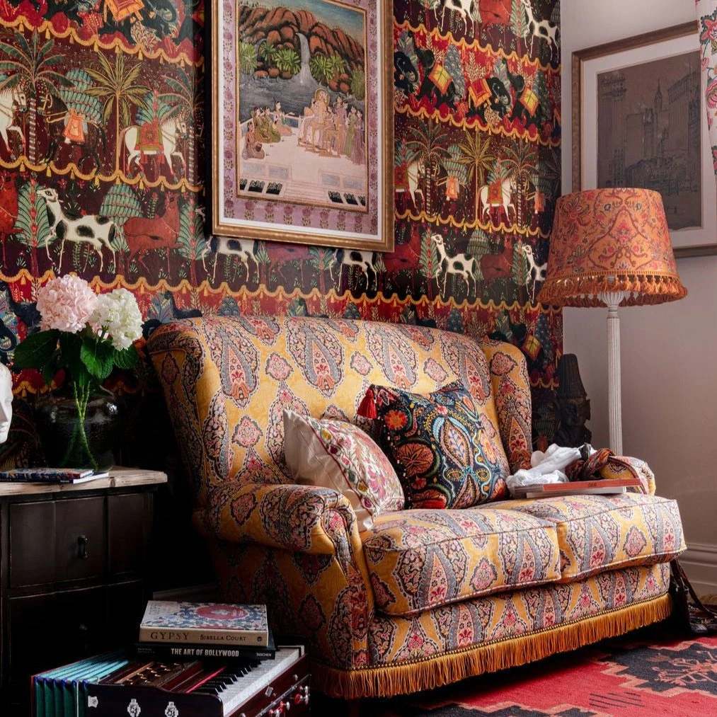 Embrace the CARNAVAL spirit with horses, cattle and elephants adorned with decorative garlands and embroidered tapestries. Lose yourself amongst exotic foliage and vivid florals while the sound of music fills the air which even the animals are dancing to. The vibrant colour combinations across the print bring it to life, bordered by tasseled, golden garlands which allow the eye and mind to transition between the settings, imagining the different scents which encapsulate you, as you wander through the magical gardens in each scene.