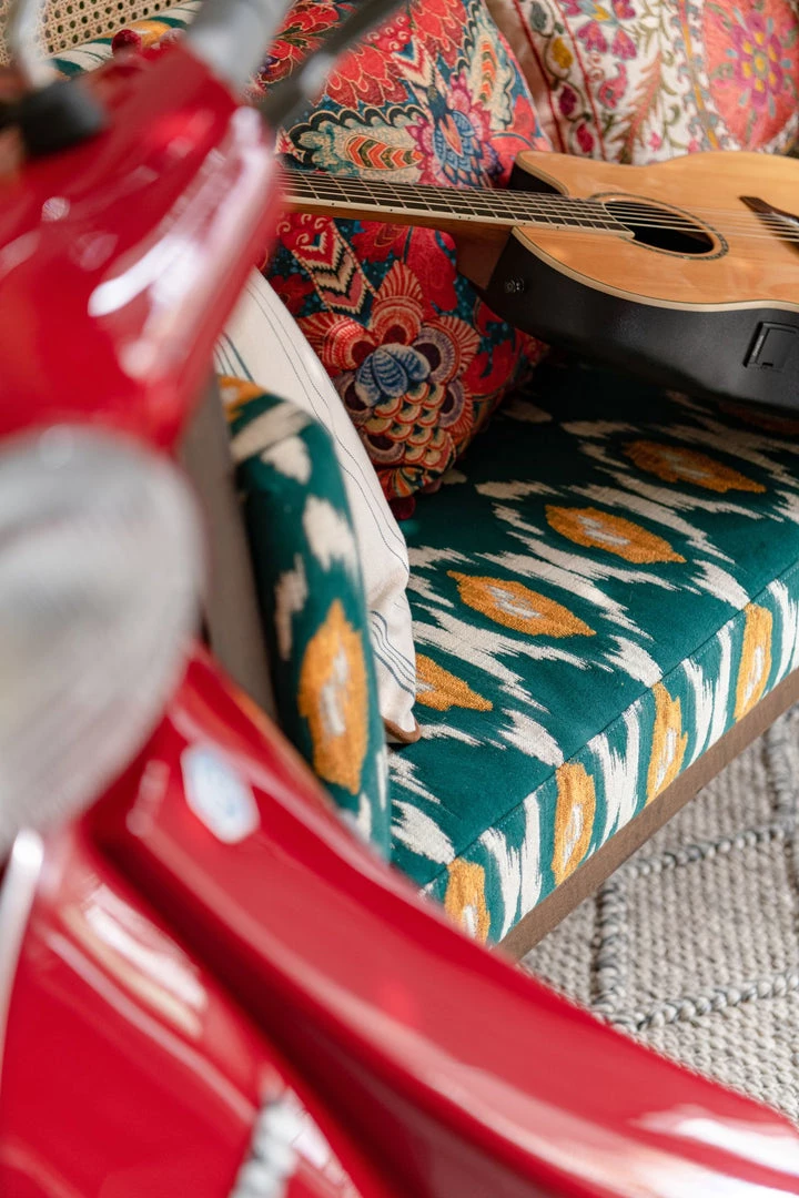 The captivating PRADESH IKAT weave presents a striking colour combination with the orange and neutral tones complementing the opulent green hue of its background. Step into its ethereal beauty almost resembling vibrant florals amongst dense green pastures, filling the imagination with fragrant aromas as your eyes are transfixed in the exquisiteness of the pattern itself.