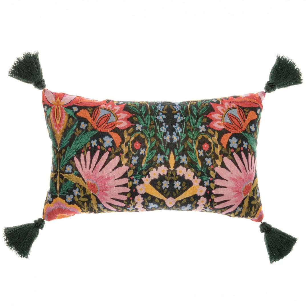 Pink florals and circular chains of blooms representing peace symbols dazzle across the black background on the SUSIE Q cushion. Bringing a whimsical, yet elegant feel to the print, the alluring pinks, yellows, and greens inject joy into any interior. The four dark green corner tassels give the cushion a refined silhouette with the Uzbek hand-woven cotton trim framing it gracefully, while complementing the tones within the print itself.