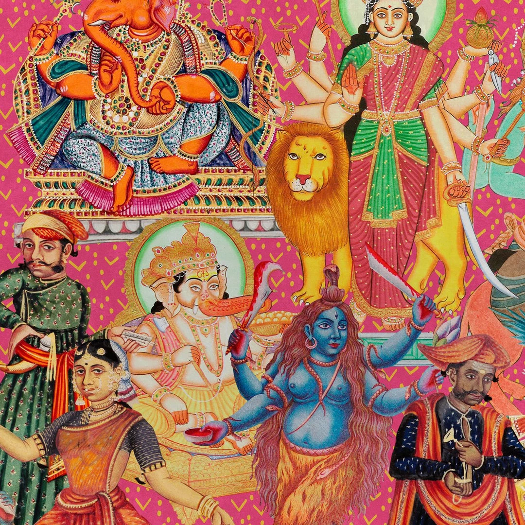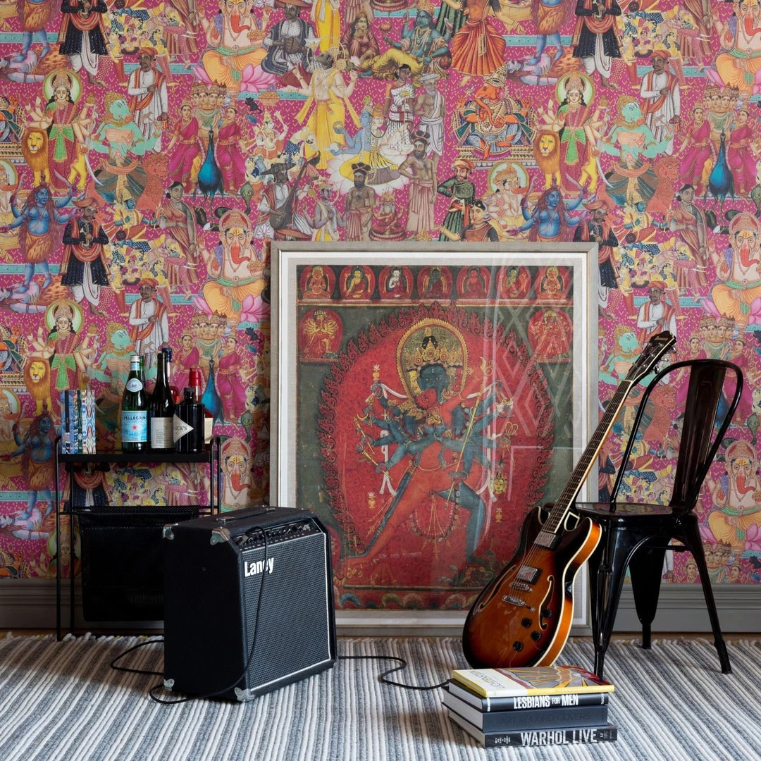Add a splash of colour to your walls with the Nirvana wallpaper from Mind The Gap. Inspired by the Pop Art movement, this wallpaper features a collage of hand-drawn Hindu Gods and Goddesses. This wallpaper will be sure to make an impressive feature in any home. Easy to put up with the paste the wall application and will add a bit of quirk to any room whether it is one wall or all. This wallpaper is digitally printed using eco-friendly inks. Printed across three rolls to maximise the pattern repeat.Â