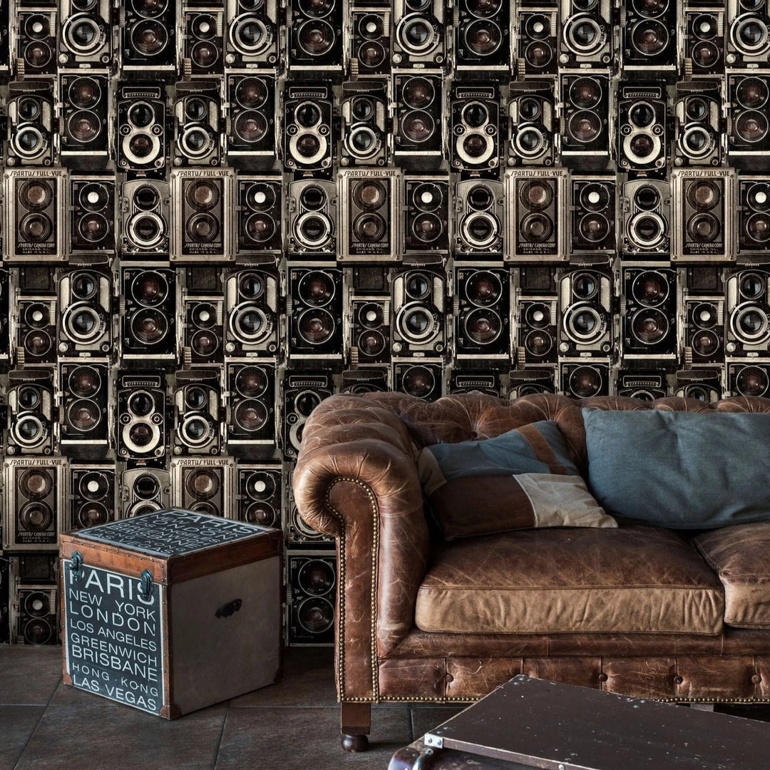 Cover your walls with retro cameras with the Obscure Light wallpaper from Mind The Gap, inspired by Antiquarian’s work. Perfect to make a statement in any room. Easy to put up with the paste the wall application and will enhance any room whether it is one wall or all. Also available in a darker colour palette.Â