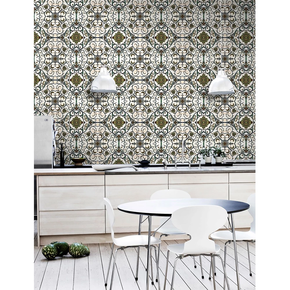 Inspired by Renaissance patterns, the botanical Organic Tile Wallpaper by Mind The Gap creates an impact with earthy and neutral tones. It is easy to put up with the paste the wall application and will enhance any room whether it is one wall or all.