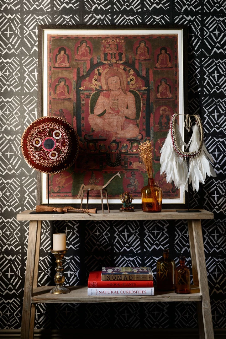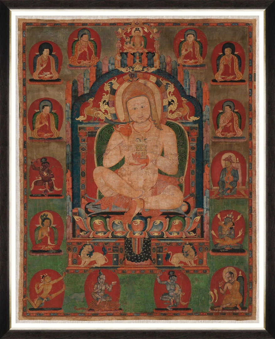 This statement framed artwork depicts the epithet Jnanatapa ‘heat of wisdom’, printed onto linen. Originally created for the Riwoche monastery in Eastern Tibet, Jnanatapa sits amongst the painting’s veil, a name denoting a famous Indian mahasiddha, the spiritual fathers of Tantric Buddhism. This framed artwork would hang perfectly with the gorgeous wallpapers from our curated collection, Indigena.Â