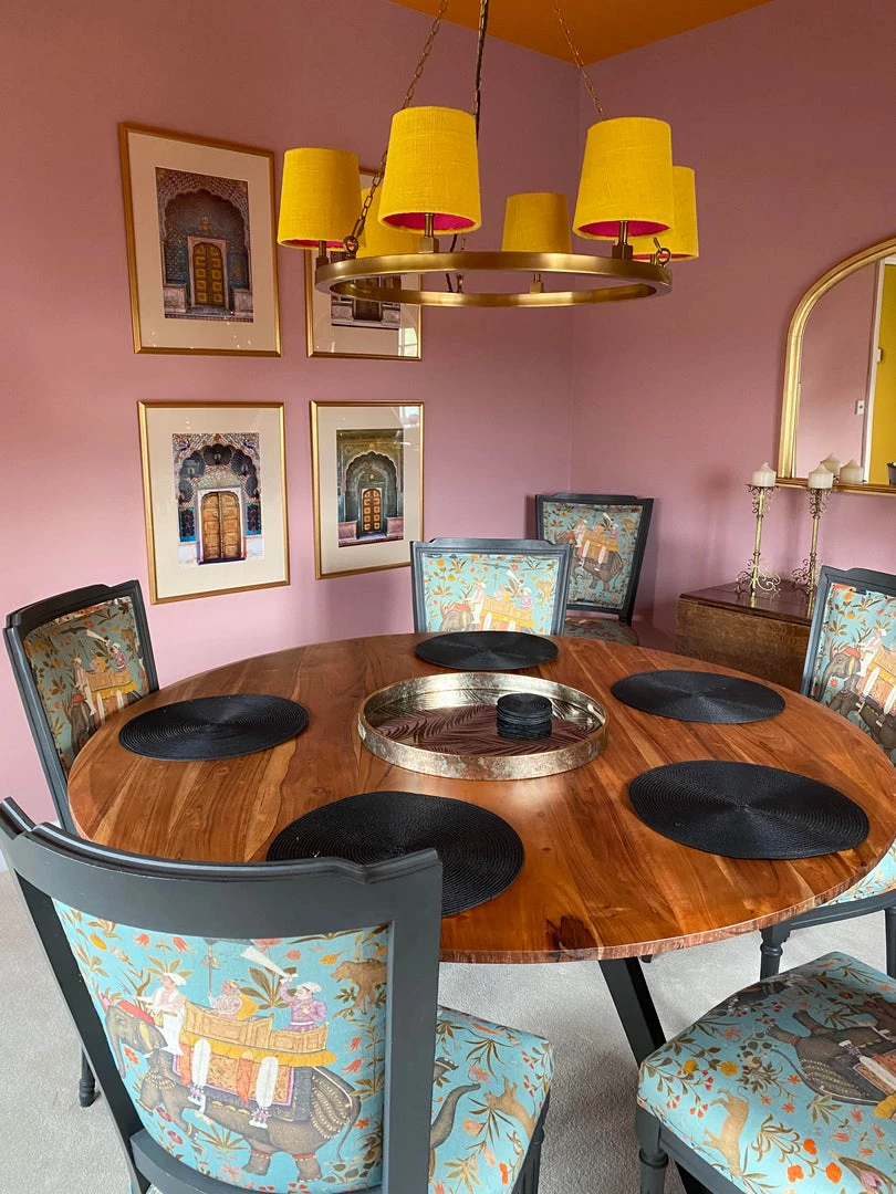 Mind the Gap’s collection of whimsical fabrics continues into this eclectic offering of furniture. A Neo-classic style dining chair upholstered in the green option of HINDUSTAN AQUAMARINE Linen. Shaped with a slightly curved back and pointed wing tips, finished with decorated turned legs in a distressed paint.Â