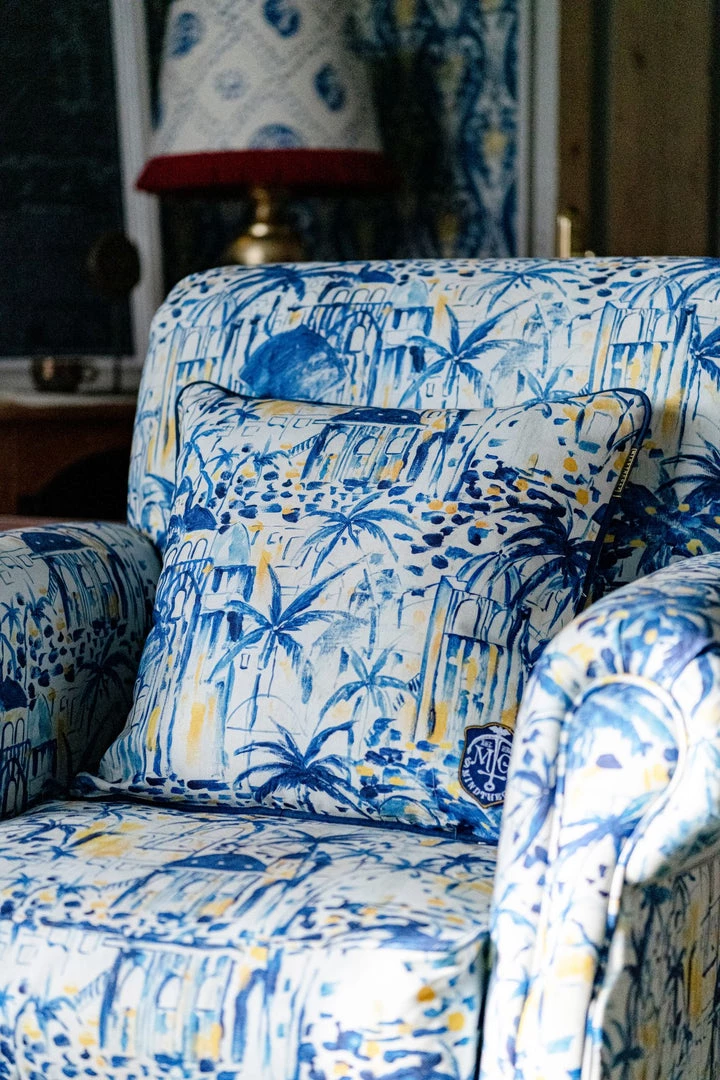 Cushion 50x50cm with front and back printed RHODES fabric, finished with indigo piping, embroidered maritime crest on the lower right corner, nude zipper, 100% duck feathers filling