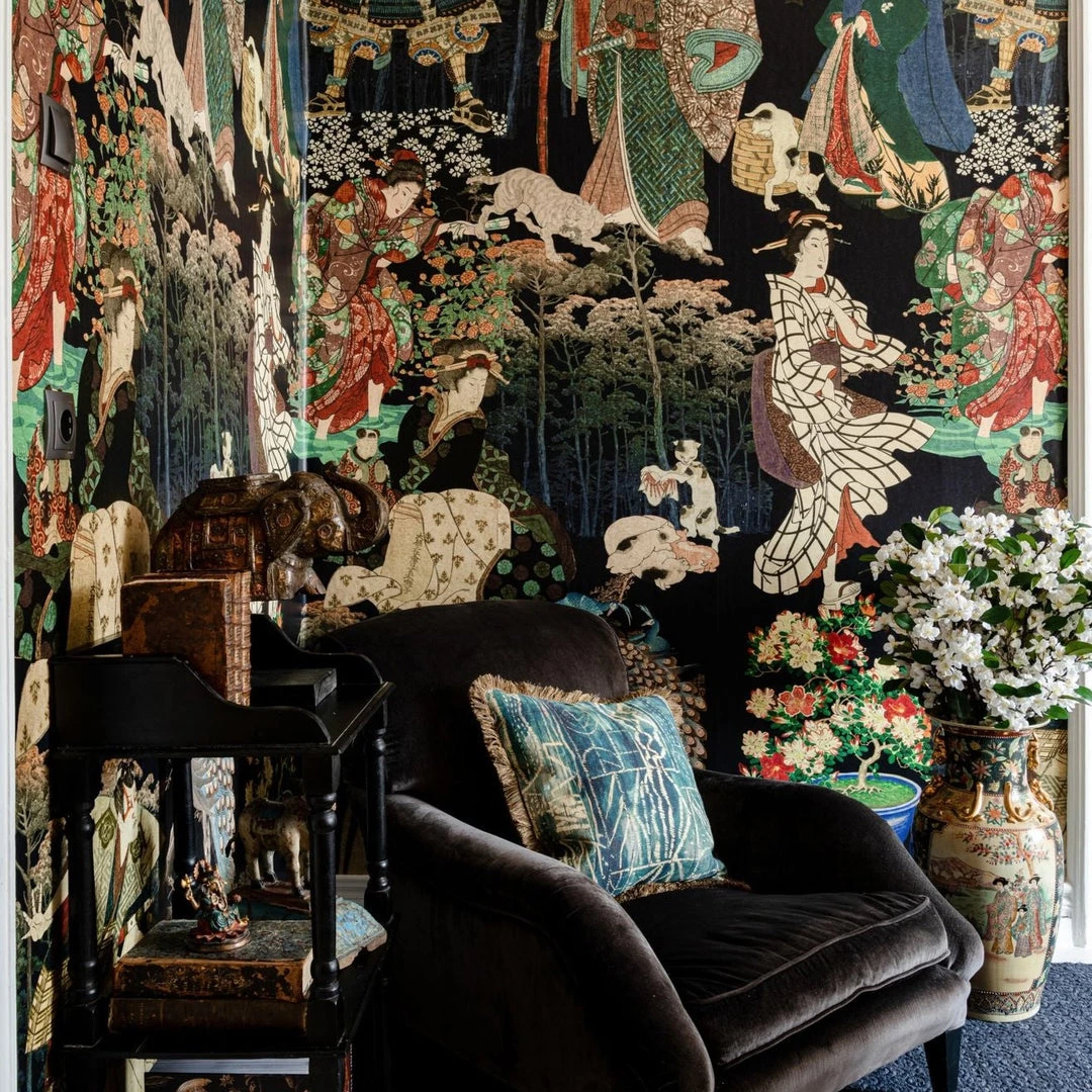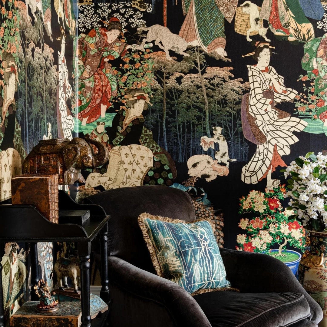 Decorate your walls with the beautiful Samurai And Geisha wallpaper from Mind The Gap. Make your walls come alive as vibrant, traditional Japanese characters emerge from within a dark forest. Each figure is adorned with rich and colourful kimonos, the flowing fabric bringing energy to the design. A vivacious statement for any home. Easy to put up with the paste the wall application and will add a bit of quirk to any room whether it is one wall or all. This wallpaper is digitally printed using eco-friendly inks. Printed across three rolls to maximise the pattern repeat.Â