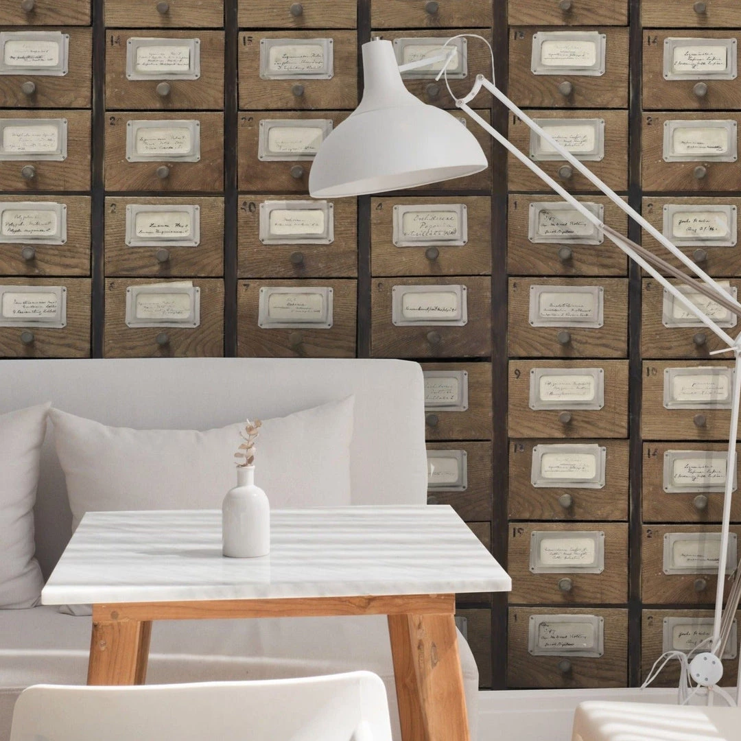 Decorate your walls with the Apothecary wallpaper from Mind The Gap. Featuring a range of vintage, personalised wood storage drawers, this wallpaper will be sure to make a statement in any home. Easy to put up with the paste the wall application and will enhance any room whether it is one wall or all. This wallpaper is digitally printed using eco-friendly inks. Printed across three rolls to maximise the pattern repeat. Available in neutral and warm.