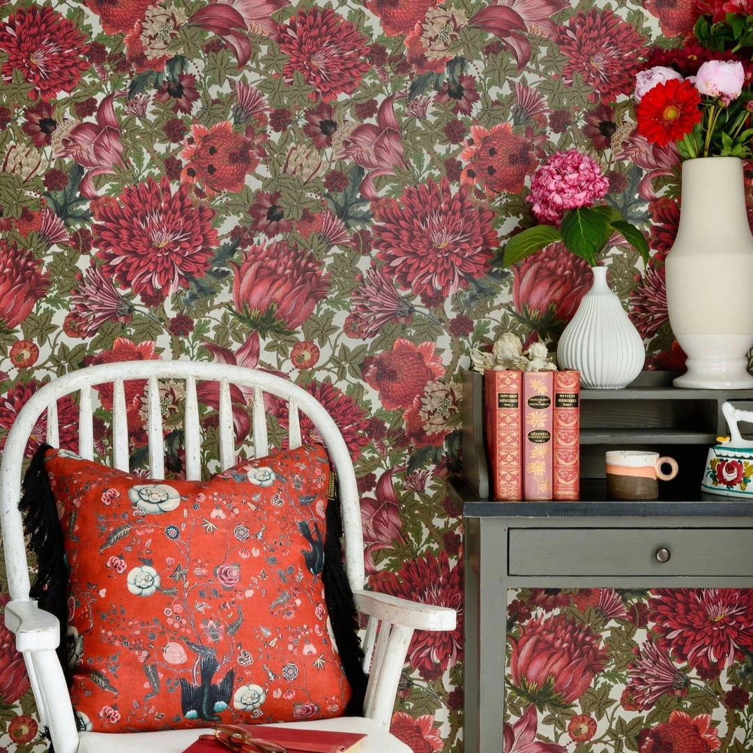Unveiling the charm of nature’s authentic patterns, flares of flower details and bursts of bright colours in a beautiful botanical print. Available in light cream or green backgrounds. Folk Couture at it’s finest. Easy to put up with the paste the wall application and will add a bit of quirk to any room whether it is one wall or all. This wallpaper is digitally printed using eco-friendly inks.Â
