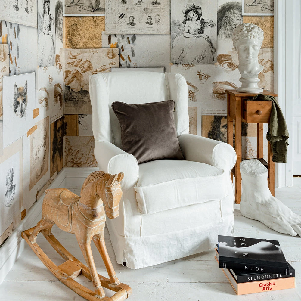 MOOD BOARD celebrates the joy in recording, collecting and displaying that which inspires and captivates you. Pinterest, be gone – here we delight in the physical act of sketching, cutting and sticking, with the pattern echoing the tactility of paper affixed to the wall. Hand drawn studies of figures, flora and fauna, details and drawing techniques are recognised for their expressive, decorative qualities and combined into a beguiling design full of life and narrative, in gentle monochromes and the sepia tones of time-aged paper and tape. The design is printed over 3 panels.