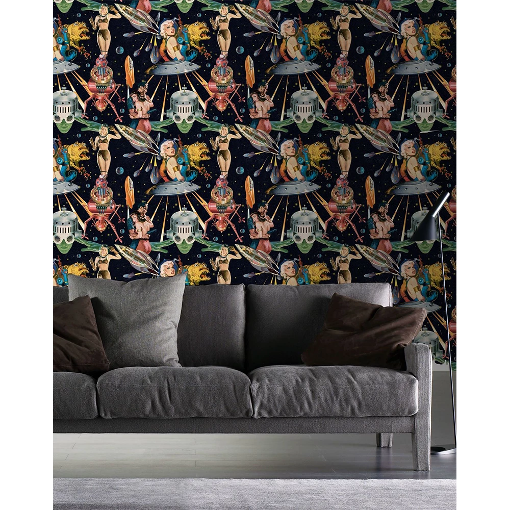 Travel into space with the Other Worlds wallpaper to find retro space opera characters from the Comic Books Collection. Use to enhance any room whether a maximalist statement or feature area.Â