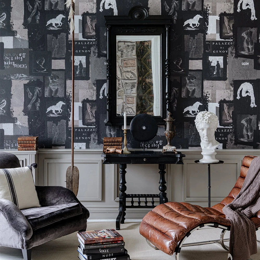 Surround yourself in the moody and atmospheric Studio wallpaper from Mind The Gap. Featuring a gathering of inspiration, the beginning of a creative concept not many get to see. A lovely monochromatic paper perfect for any home. Printed across three panels to maximise the pattern repeat. Easy to put up with the paste the wall application and will add a bit of quirk to any room whether it is one wall or all. This wallpaper is digitally printed using eco-friendly inks. Available in both dark and light colourways.Â