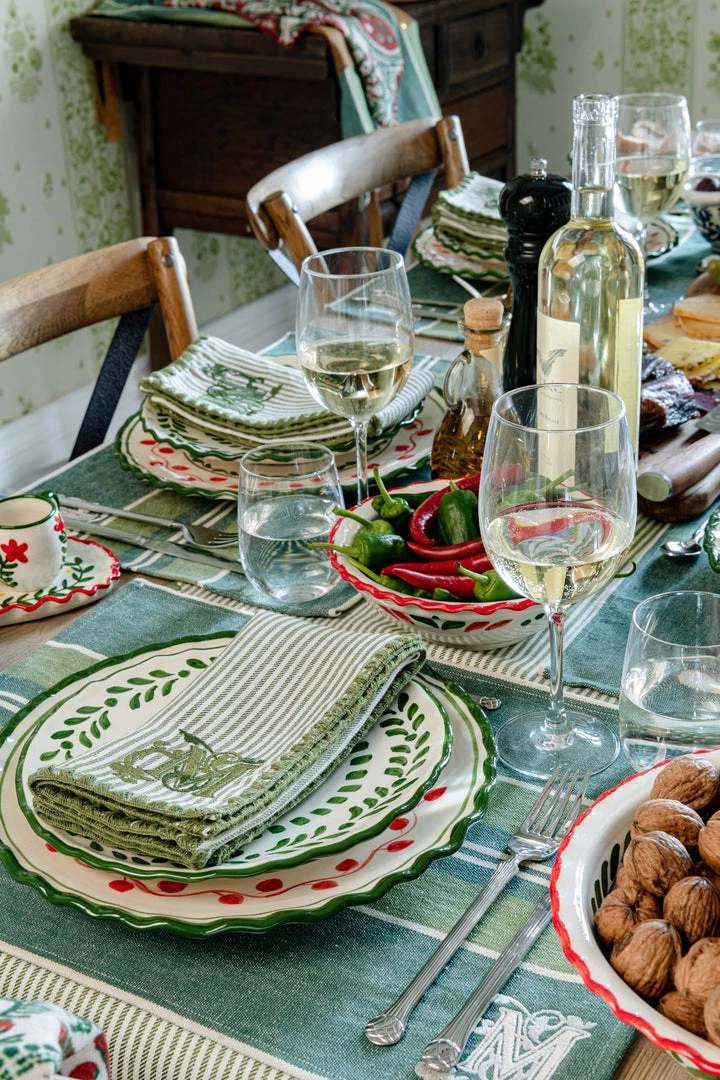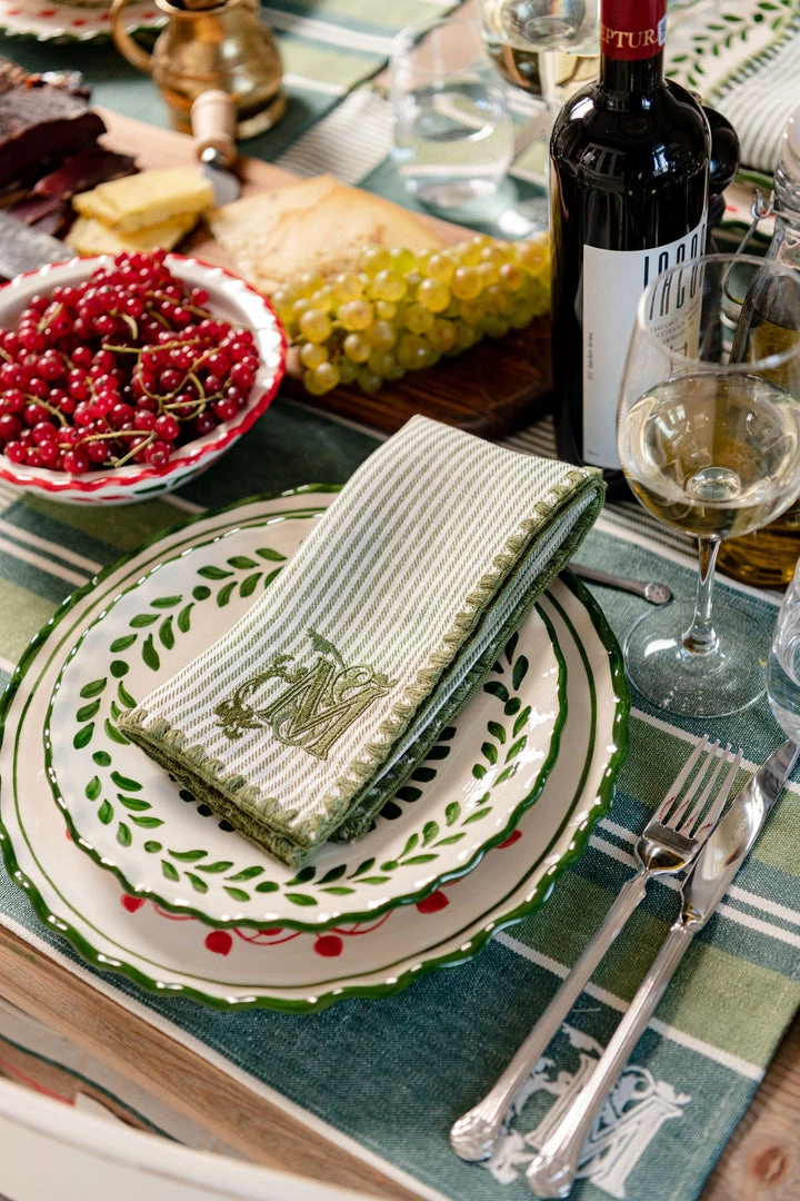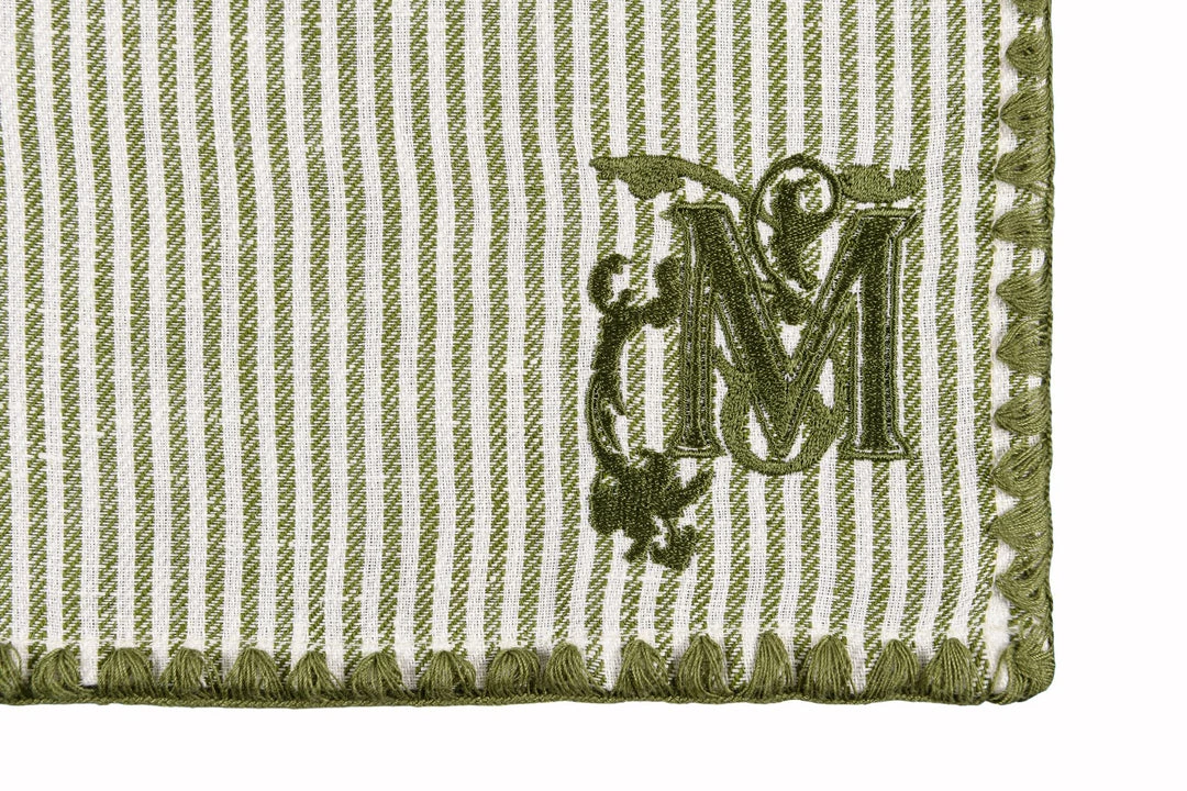 This fine linen fabric 210 gsm., carefully woven and tailored, benefits of a soft-washing treatment to obtain a delicate touch. The stonewashed napkin is edged in characterful light green scallop crochet, showcasing our leafy woven M logo which acts as a statement finish to this precious item.