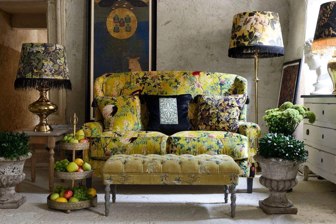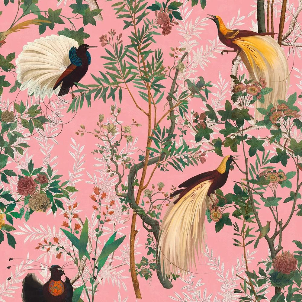 A lush and whimsical design that brings the lushness and mystery of a Royal Garden indoors . A rich cotton pile velvet. A lush pink background with colourful touches from the feathers of beautiful species of pheasants. Â
