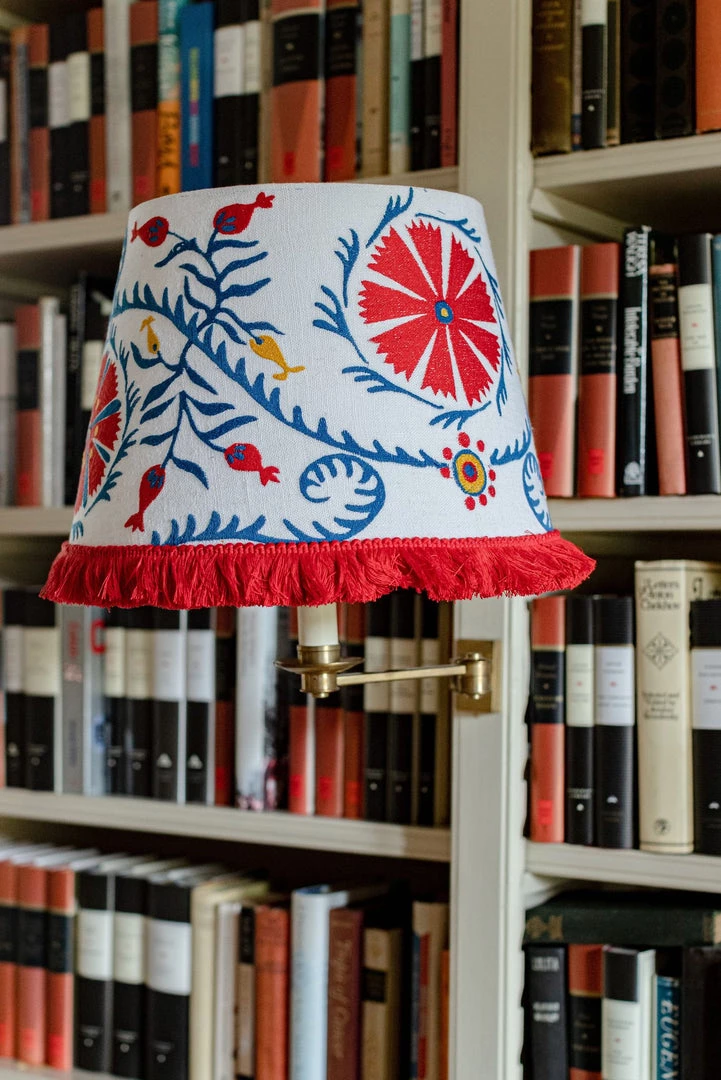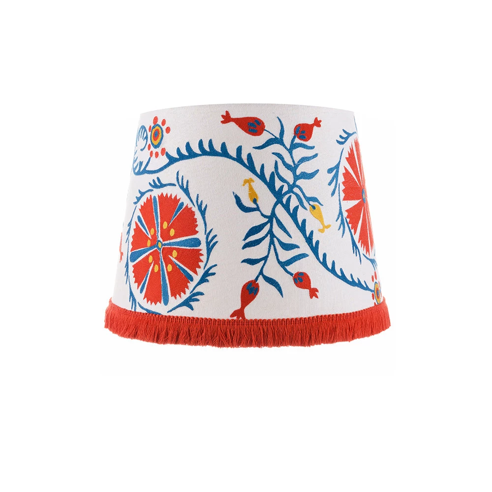 An elegant and distinguished lamp, with red, blue and soft yellow hues in a large embroidered traditional folk design. Finished with red cotton fringes and fitted with reversible gimbal and white fabric lining. Part of the Transylvanian Roots collection. Folk Couture at it’s finest.