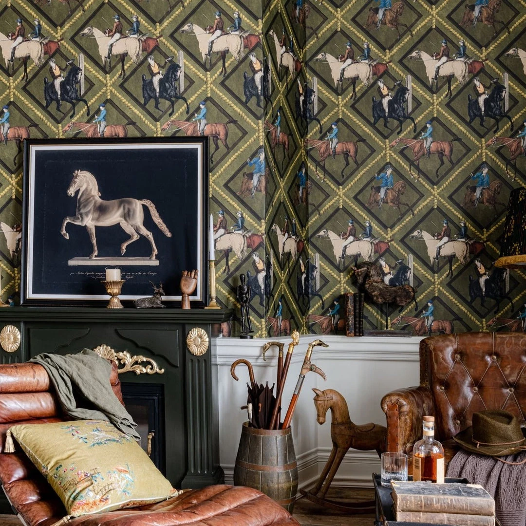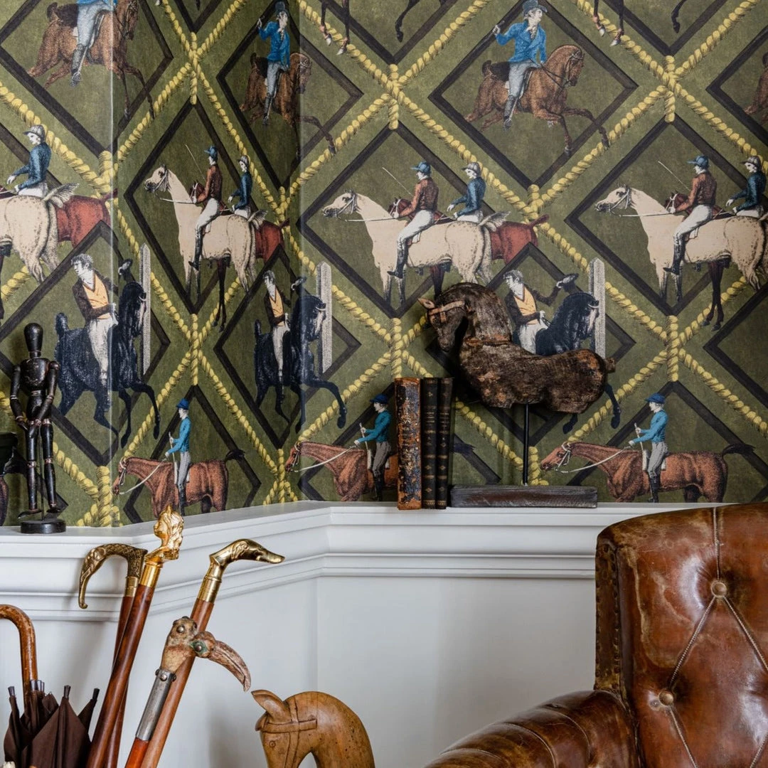 Surround yourself with the impactful Gymkhana wallpaper from Mind The Gap. An energetic design featuring horses and their owners cantering, galloping and jumping within the diamond shapes. Choose your favourite to win. Available in both khaki and grey. Easy to put up with the paste the wall application and will add a bit of quirk to any room whether it is one wall or all. This wallpaper is digitally printed using eco-friendly inks.Â