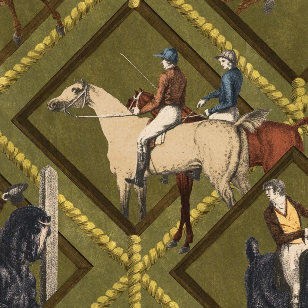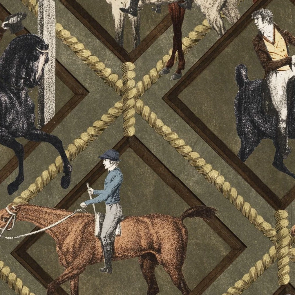 Surround yourself with the impactful Gymkhana wallpaper from Mind The Gap. An energetic design featuring horses and their owners cantering, galloping and jumping within the diamond shapes. Choose your favourite to win. Available in both khaki and grey. Easy to put up with the paste the wall application and will add a bit of quirk to any room whether it is one wall or all. This wallpaper is digitally printed using eco-friendly inks.Â