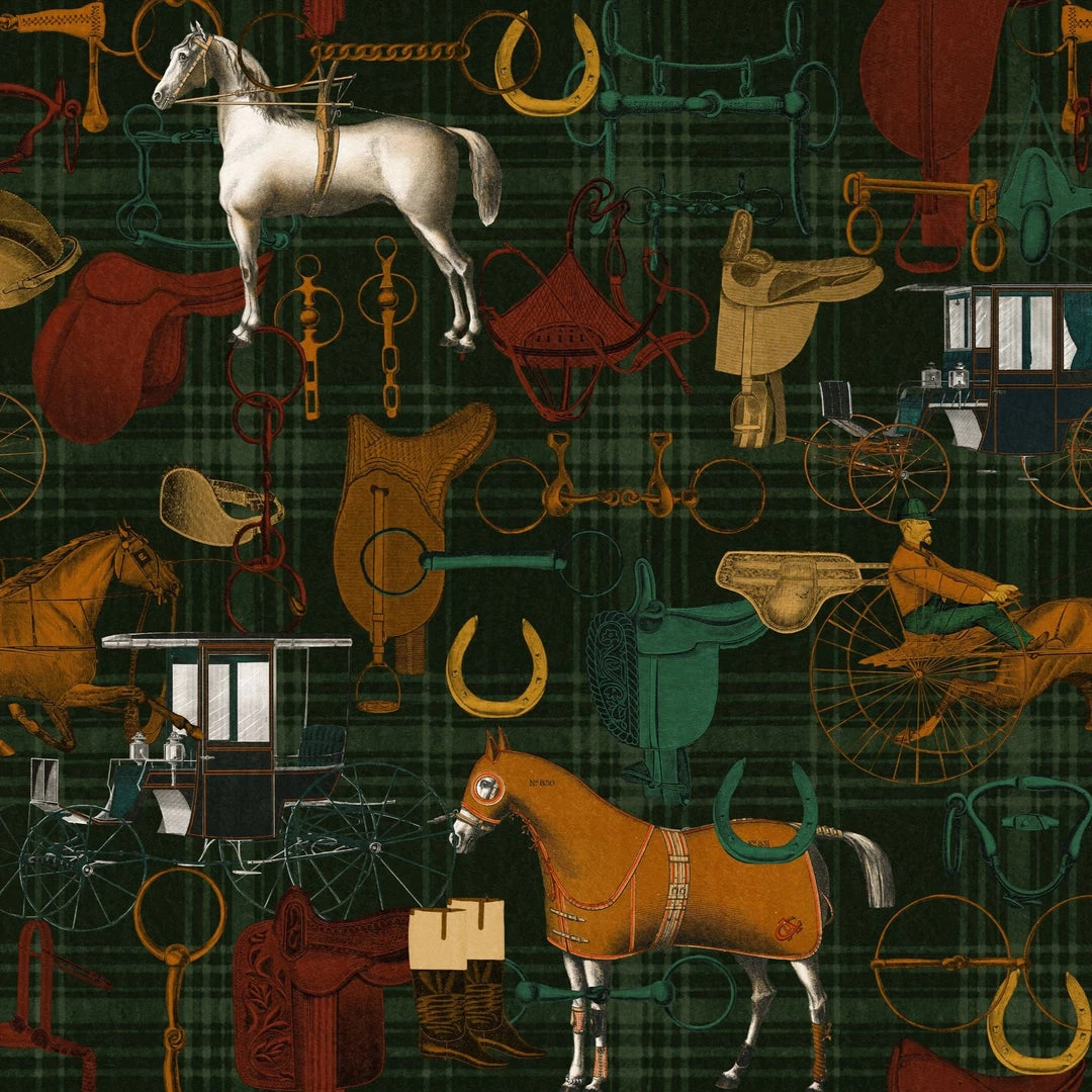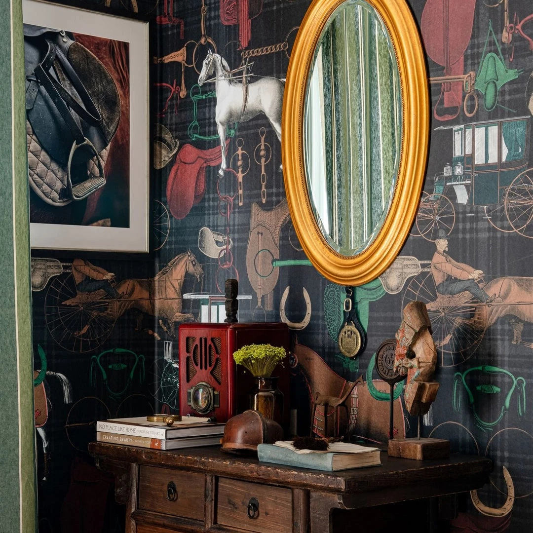 Surround yourself with the impactful The Jockey wallpaper from Mind The Gap. Perfect for all lovers of horses, this design features a range of beautifully illustrated objects from boots and bridles to carriages and horse shoes to create a rich and vibrant statement in any home. Available in both multicoloured and faded colourways. Easy to put up with the paste the wall application and will add a bit of quirk to any room whether it is one wall or all. This wallpaper is digitally printed using eco-friendly inks.