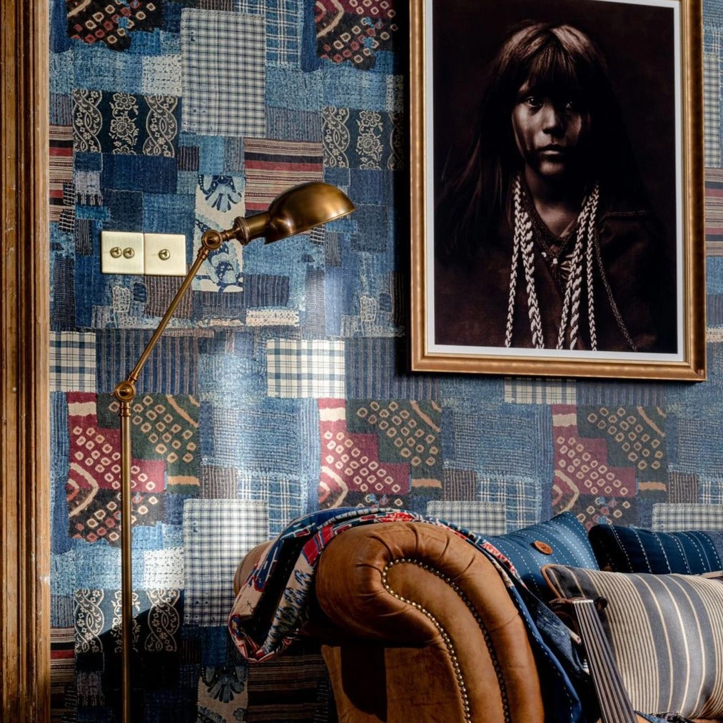 Denim symbolized the rise of the counterculture with its raw finish and variety of application referencing the characteristics of the movement itself. Become spellbound in the memories from each cutting across the WOODSTOCK BORO print with different patterns and materials giving a glimpse into the fashions and trends of the era. This patchwork collage brings a sense of materiality as you imagine running your hands across the different layers and textures which, when placed together, fill the room with a visceral, yet stylish backdrop.