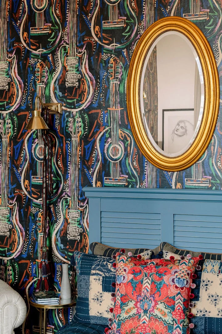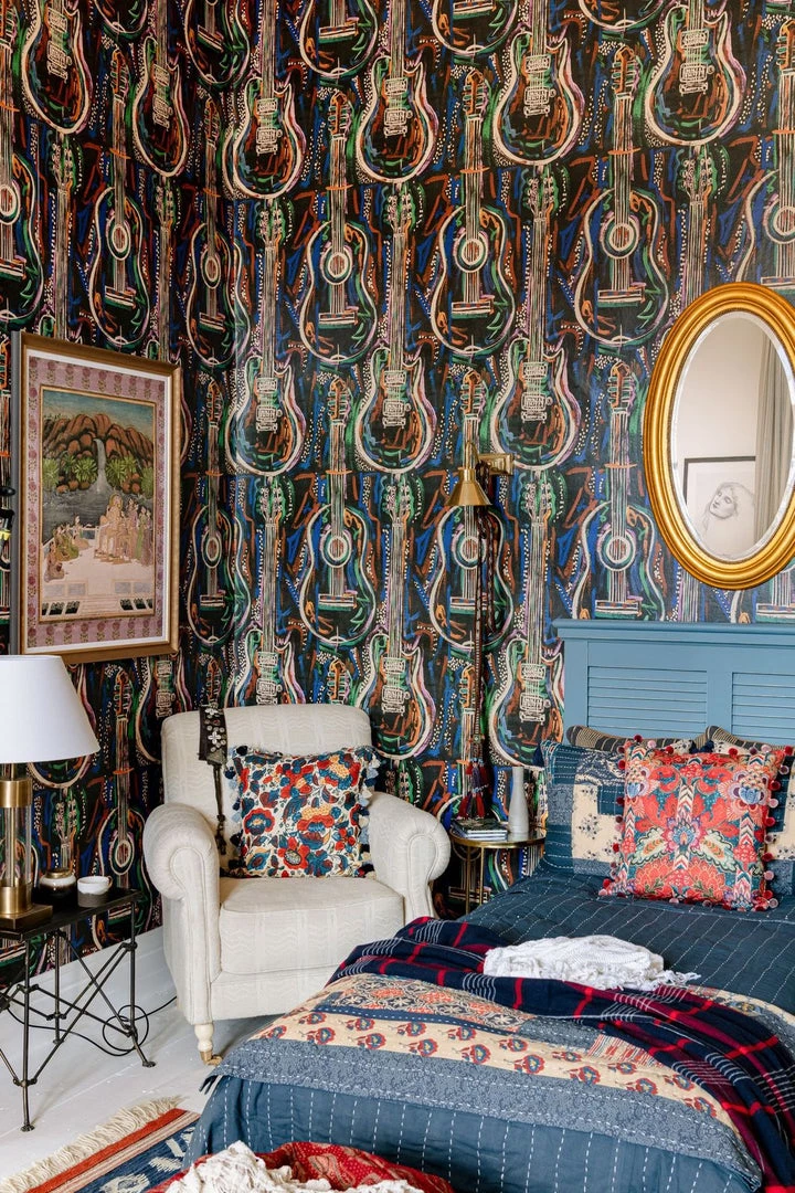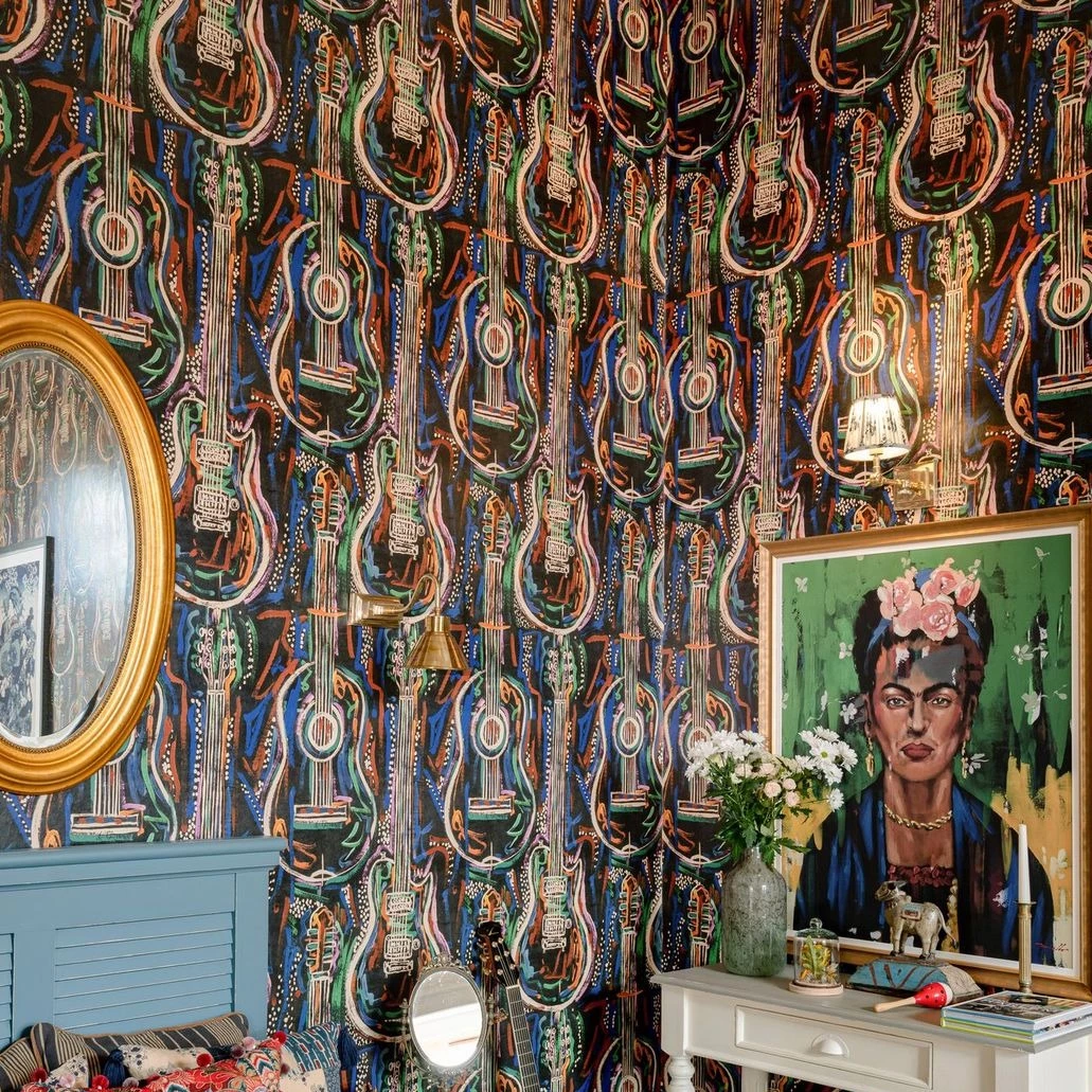 Woodstock was all about the music and behind the music lies the magic of the instrument. The HARMONY wallpaper celebrates the form and beauty of the guitar, set amongst swirling abstract lines in psychedelic colours which emulate the dreamlike atmosphere of the festival itself. Get lost in the sounds of acoustic and electric guitars, playing riffs, or strumming chords to the rhythm of the song which fills the room. Dream of your favourite music genre and let the guitars take you there as they stand out across both white and black backdrops.