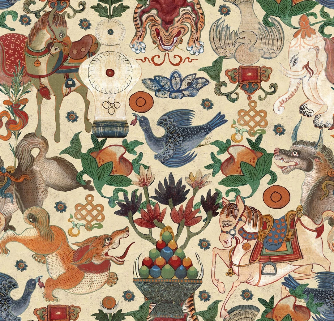 Expect the unexpected in the mystical world of INCANTATION. Where creatures roam freely through an enchanted setting, stay alert as you never know what lies around the corner. Exotic birdlife, ornamented horses and mythical dragon-like animals will surround you, as you wander through gardens filled with striking florae and intricate architectural figures. With backdrops of cream, dark blue and yellow, this vivacious print opens your senses as you imagine a rich, aromatic scent flowing through the air in this fascinating and captivating domain.