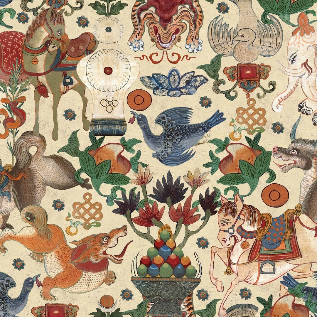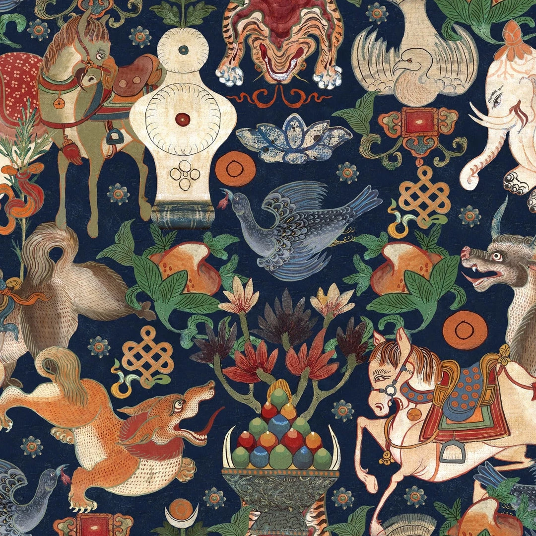 Expect the unexpected in the mystical world of INCANTATION. Where creatures roam freely through an enchanted setting, stay alert as you never know what lies around the corner. Exotic birdlife, ornamented horses and mythical dragon-like animals will surround you, as you wander through gardens filled with striking florae and intricate architectural figures. With backdrops of cream, dark blue and yellow, this vivacious print opens your senses as you imagine a rich, aromatic scent flowing through the air in this fascinating and captivating domain.