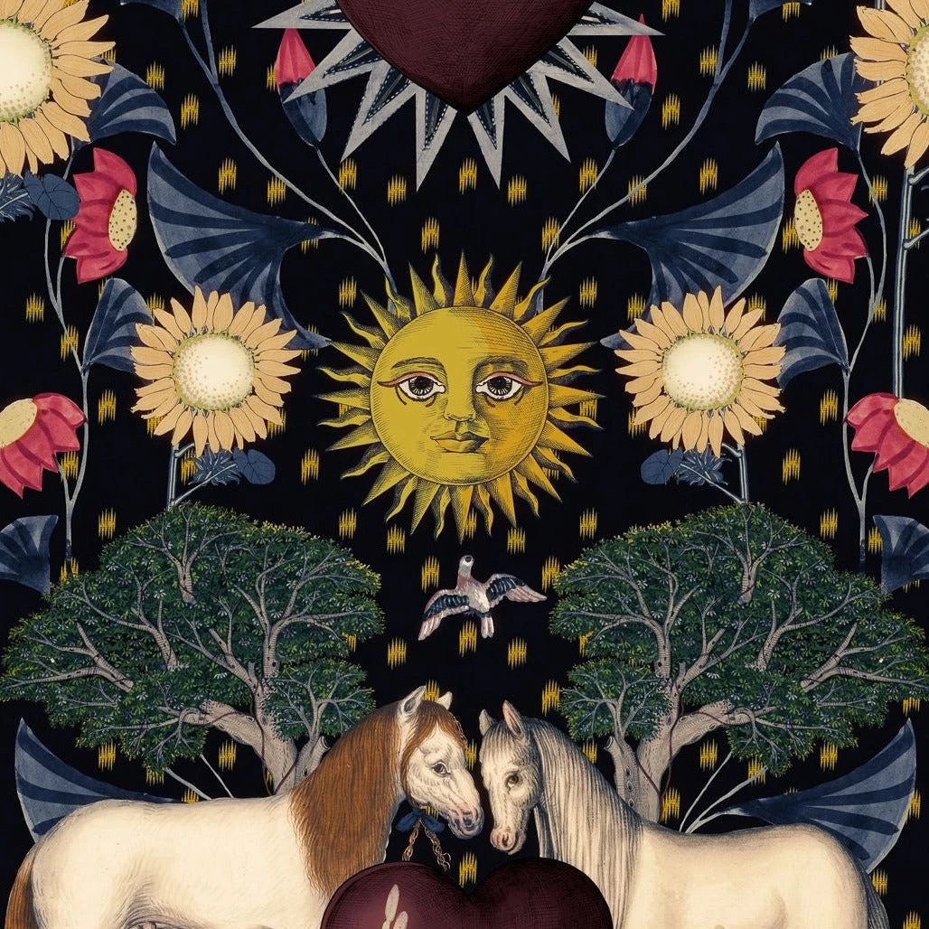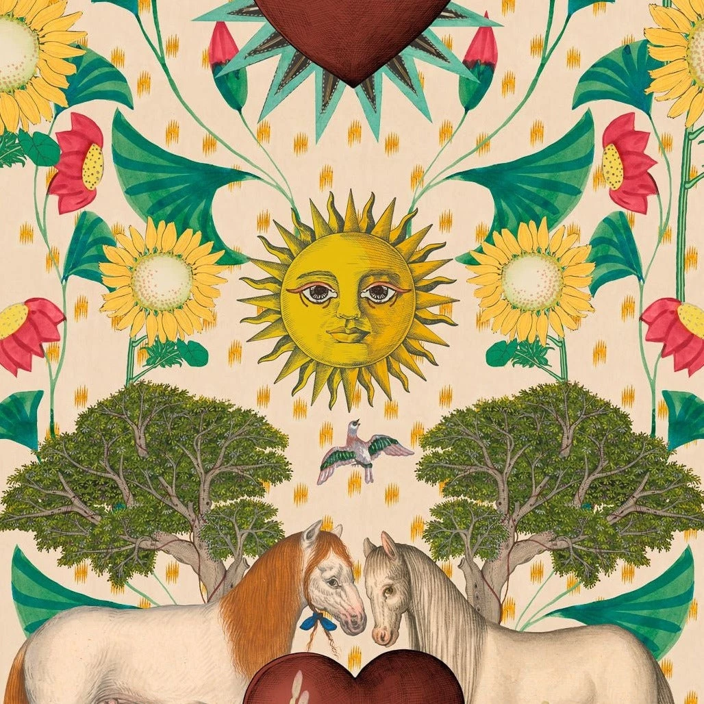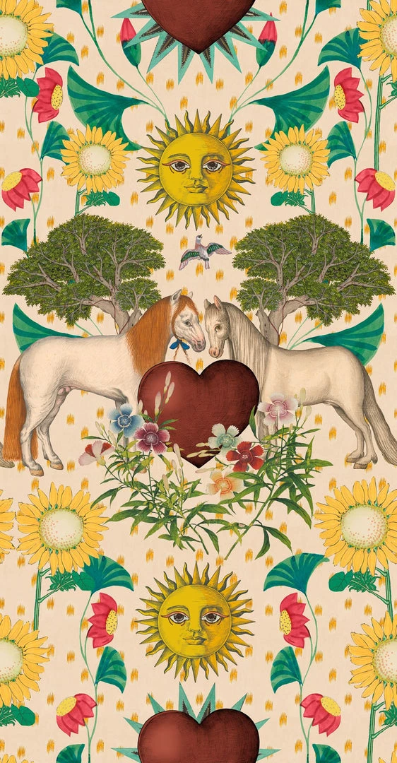 Meander through golden fields of sunflowers while wild horses graze under the shadow of woodland nearby. Symbolic hearts radiate a sense of comfort and peace as you lose yourself in the whimsical meadows which surround you with tranquility. The sun warms your skin as you listen to the sound of birds flying above you. Evoking sounds and smells of long summer afternoons, the MIRAGE wallpaper, set on two contrasting backdrops, brings a restful ambience into the room.Â
