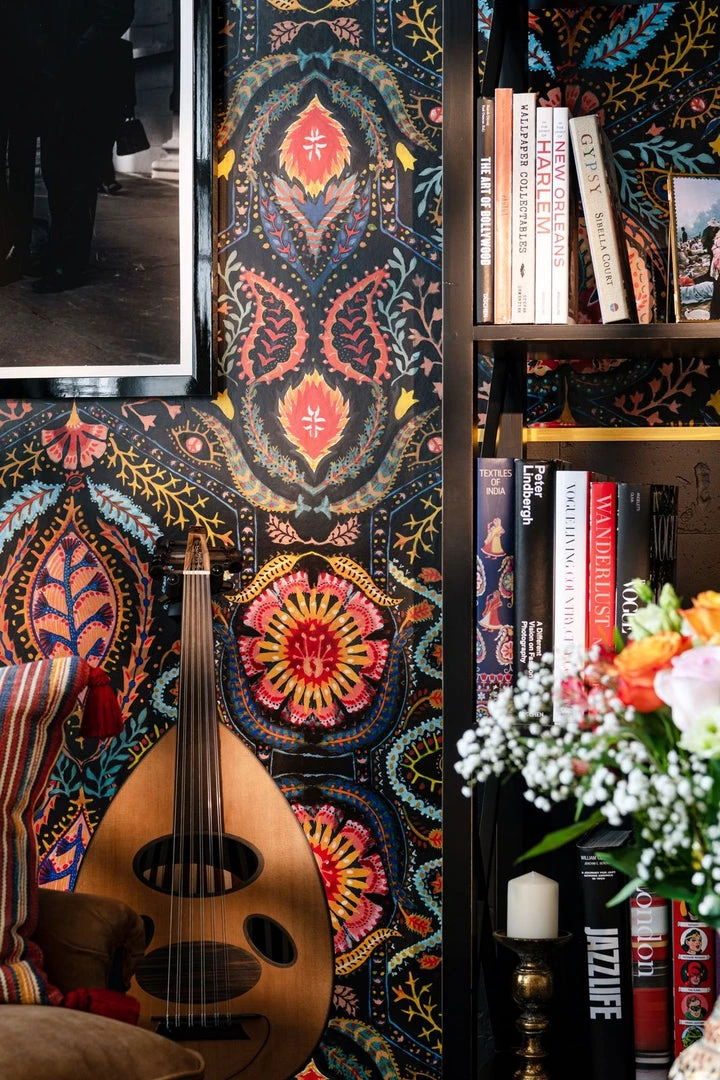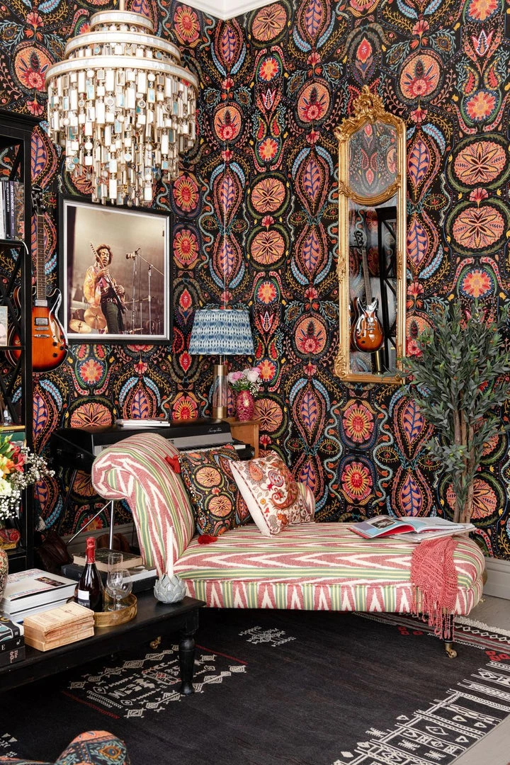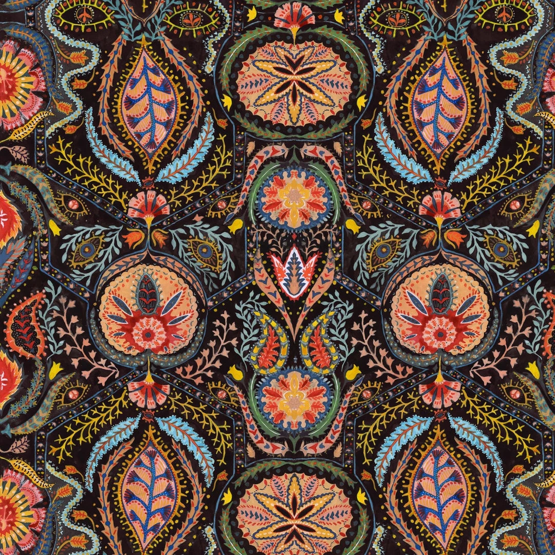 Alluding to the intricacy of the paisley and psychedelic prints of the 60s, SOUL SACRIFICE draws you into an enchanting world of colour and depth. Enticing the eye into the dark background, you get lost amongst the organic forms which entwine across the surface, lighting up the walls like stars in a night sky. Eyes seems to peer at you amongst glowing branches positioned around larger central motifs, watching as you take in the intensity of pattern and colour unfolding before you.
