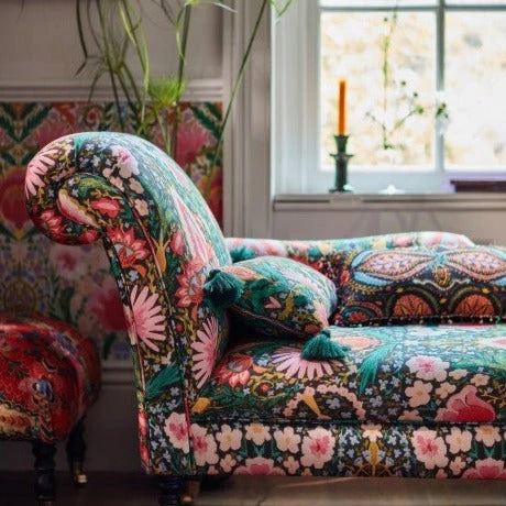 Our distinctive cushions show beautiful patterns and details of our fabrics. Made of heavy linen or cotton pile velvet all cushions are printed in England using traditional methods. Our cushions come with a variety of finishes such as fringes, tassels, pom-poms or printed borders adding little touches of luxury and uniqueness. Linens are stonewashed finished for softness and vintage effect.Â