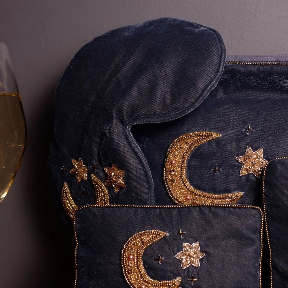 Drift off into space with our gorgeous new embroidered moon & stars luxe velvet eye mask. A gorgeous golden beads and jewels scattered beautifully on a slate grey velvet.