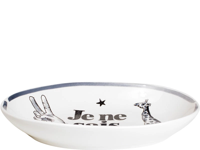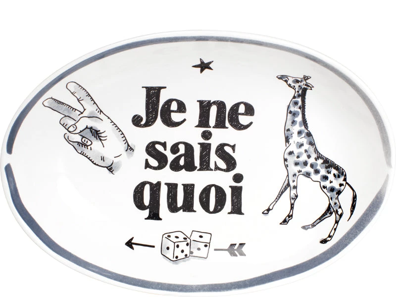 The simplest of items made special. A lovely black and white decorative plate with a message of ‘Je ne sais quoi ‘and illustration of a giraffe and dice in the center. Glazed, fine stoneware