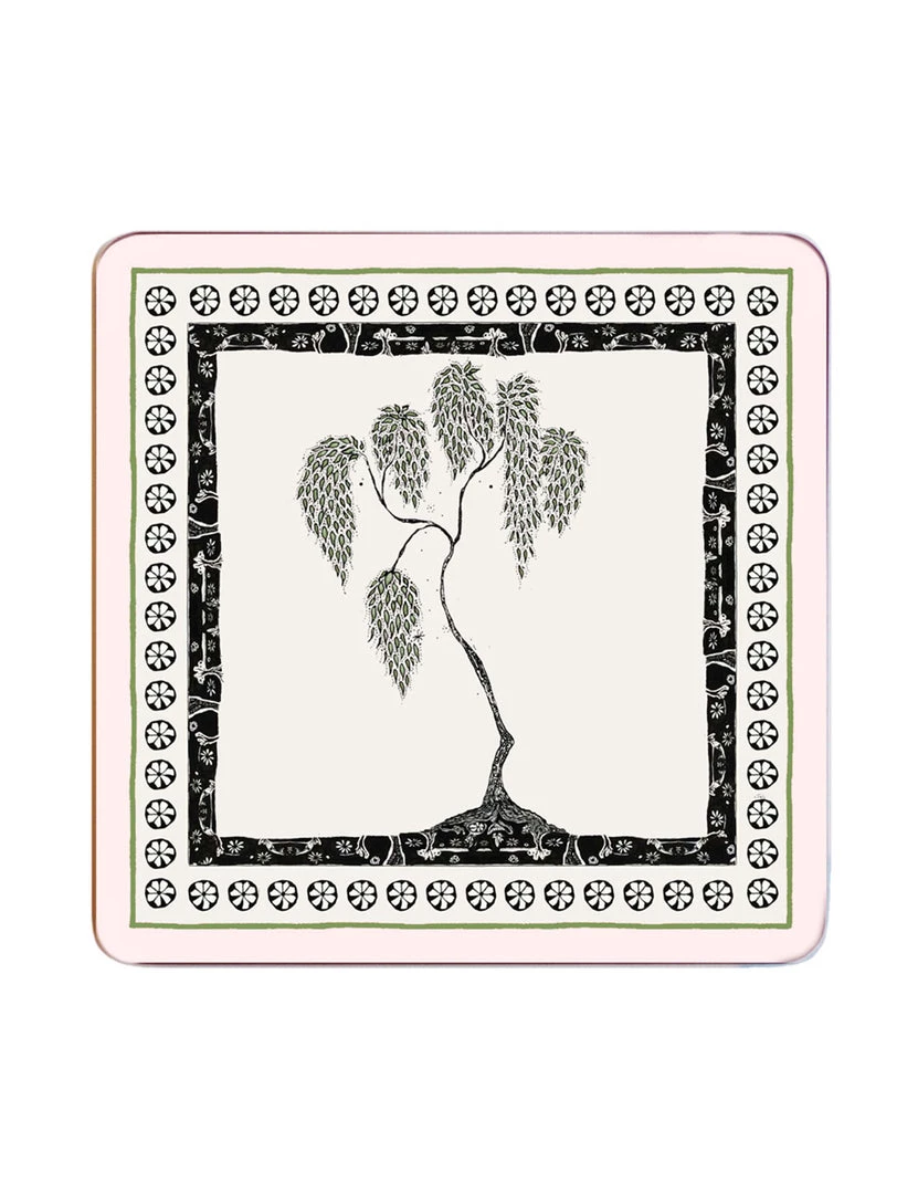 A beautifully illustrated melamine topped cork placemat. A square base with a soft white background with pink edges. Hand drawn artwork- the Forest Floor collection is inspired by the woodland which Bell’s father has created over the years. Sold individually with matching coasters available for a dramatic and unique table scape.   Â