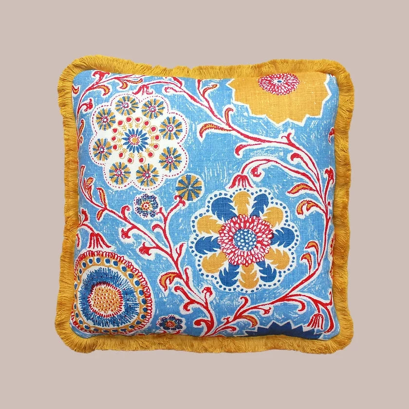 Nomad is a playful interpretation of embroidered decorative tribal textiles featuring wild climbing vines with hanging abstract fruits and flowers. The original artwork has been hand drawn by Ellen using oil pastels and pencils and then screen printed to maintain the original texture and character. Completed with a mustard yellow fringe trim and mustard back. It has an invisible zip along the bottom edge and is filled with a plump natural duck feather cushion pad.Â