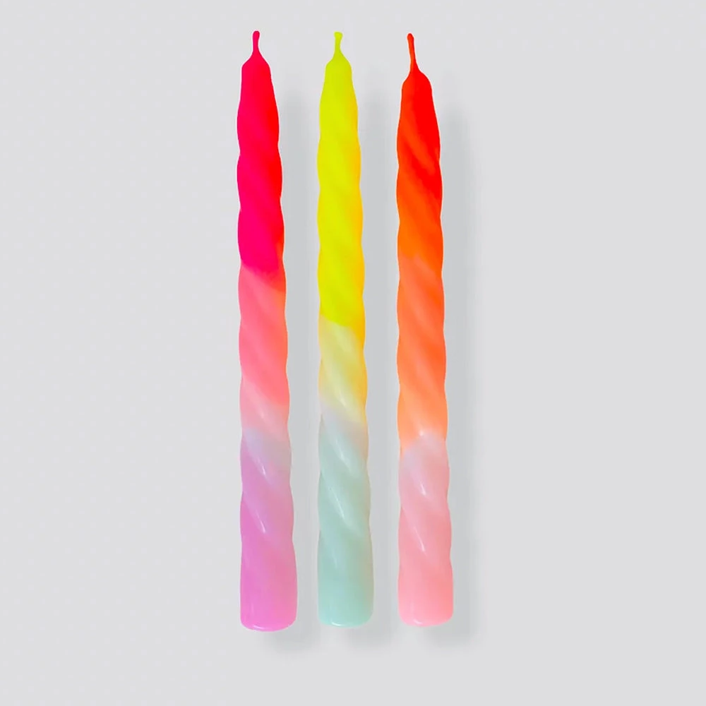 This boxed set of x 3 twisted candles will satisfy all your retro day glow dreams. A fun way to brighten up your table setting and a most unique, fun gift item.Â