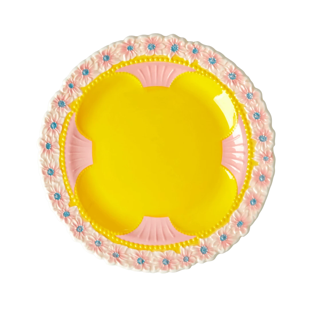 The most delightfully cute pink and yellow ceramic side plate complete with lace floral chain to brighten your meal. We love ceramics and this beautiful flower series. The design is inspired by vintage flowerpots, kitsch, and joyous. Mix and match for added fun. .