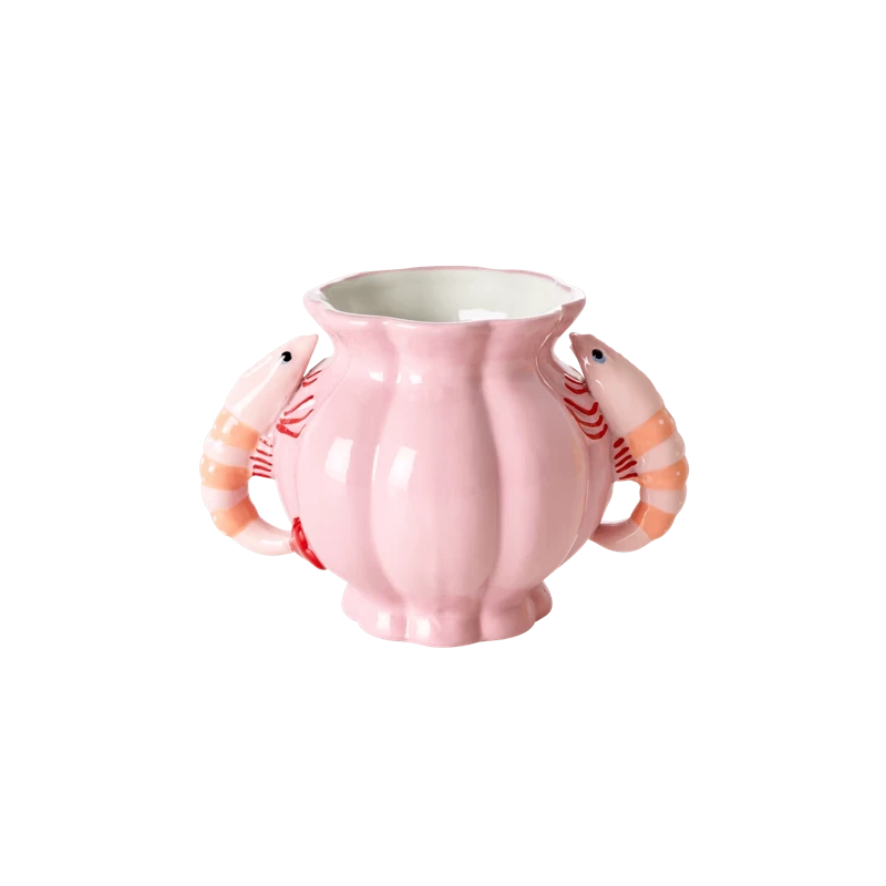 Lovely and quirky vase in a wonderful pink color. It’s made of ceramic and is designed with two small shrimps on the side. It’s perfect for a little bouquet of flowers, a bundle of pencils or a couple of makeup brushes.Â