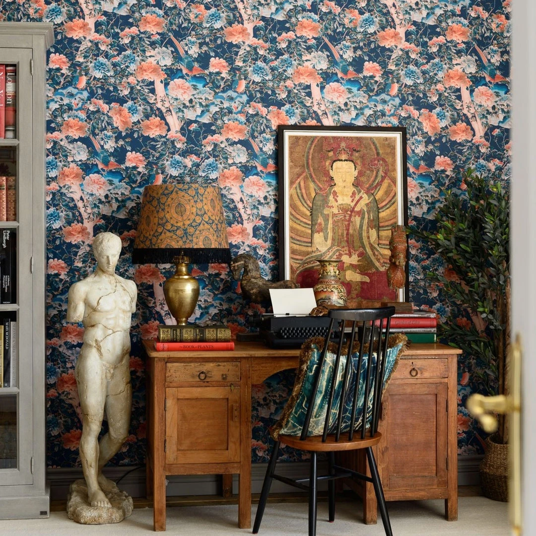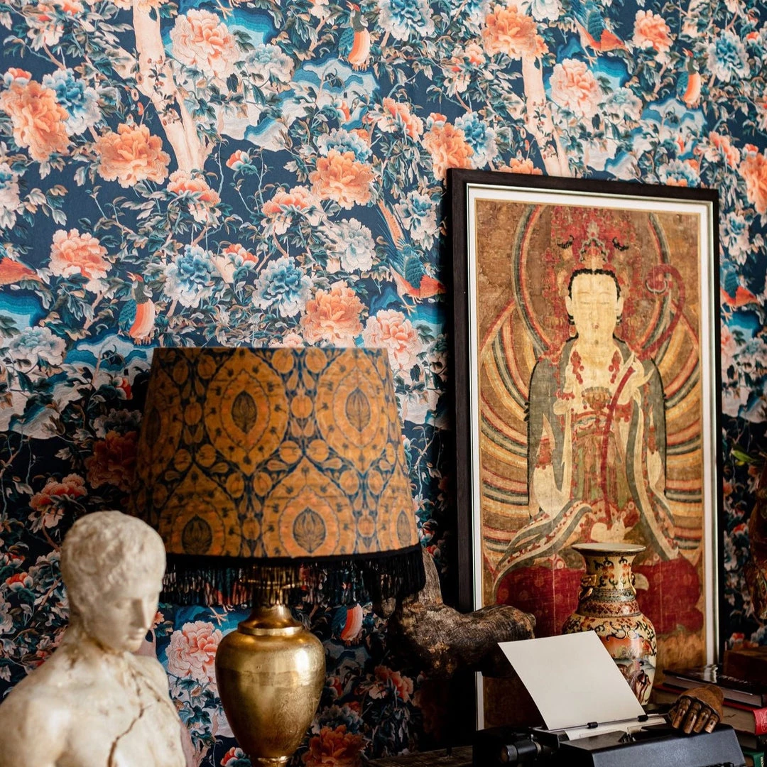 Walk through the bright, blossoming florals into A Manchurian Night wallpaper from Mind The Gap. Vibrant orange flowers sit amongst intertwining stems on a deep blue background to create the perfect and inviting space. Use to enhance any room whether a maximalist statement or feature area.Â