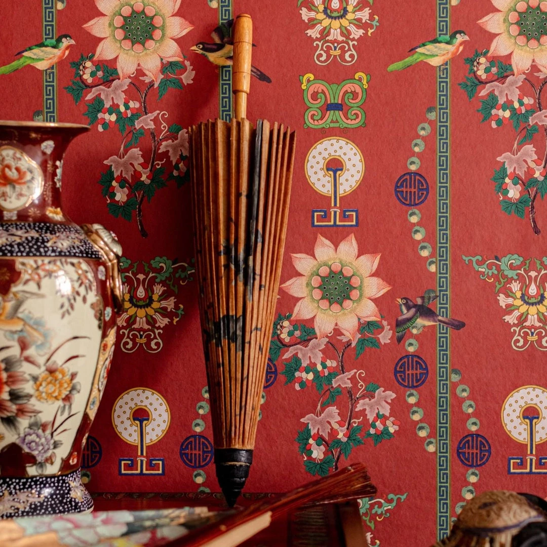 Step into a lavish, rich print inspired by a famous Chinese garden. The Lin Yuan wallpaper by Mind The Gap features intricate and elegant motifs including, florals, birds and plants on a rich red background. The Oriental motifs symbolise luck, wealth and immortality. Also available in Absinthe Green.Â
