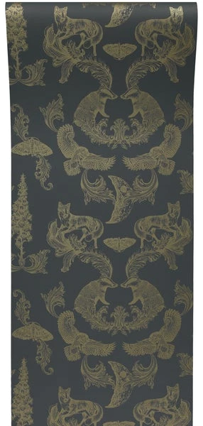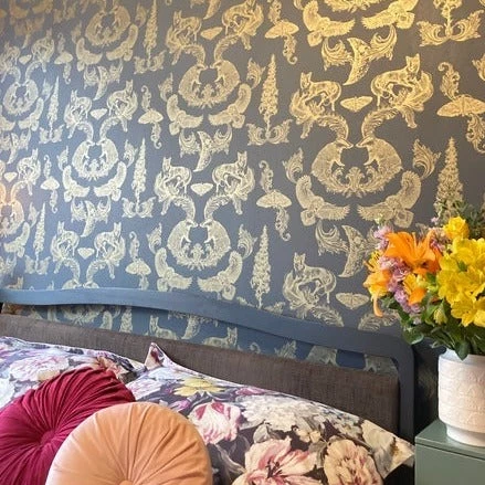 A beautiful design by Laura Garner, hand drawn illustrations featuring foxes, birds and nesting badgers. Forest foliage and a shimmering golden moon are set against a light cream background. A modern twist on an English classic, a damask style with a playful edge.Â