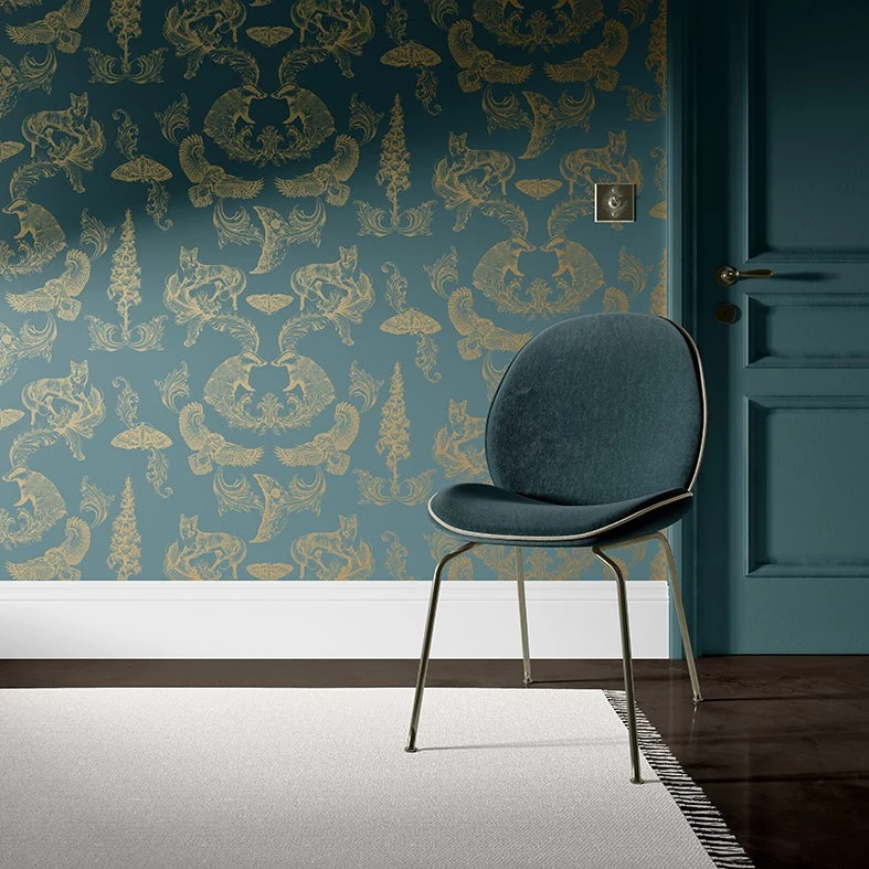 A beautiful design by Laura Garner, hand drawn illustrations featuring foxes, birds and nesting badgers. Forest foliage and a shimmering golden moon are set against a light cream background. A modern twist on an English classic, a damask style with a playful edge.Â